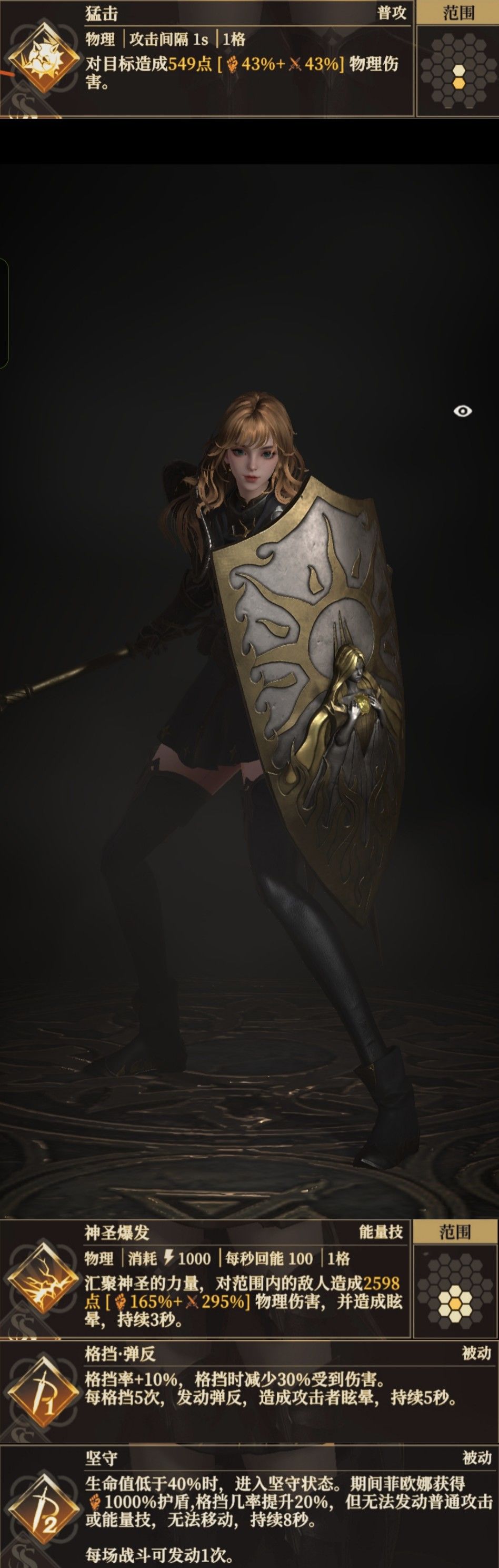 坦位是初始角色—初光之盾。堡4开局免费送的角色,但强度绝对的坦克t0,这个角色初始数值就是很顶的,拉战士一万滴血起步。被动1是格挡加弹反,很强单体控制!被动2龟壳,血量低于40%触发一个1000%的力量数值的护盾,比如力量为10000触发的护盾就是10000,另加30分格挡率。主动技就是角色周边六格的群体控制。