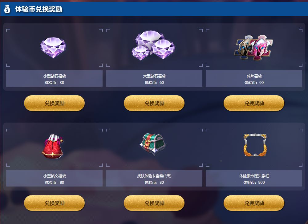 2.体验服对局获得的体验币可兑换各种正式服奖励;