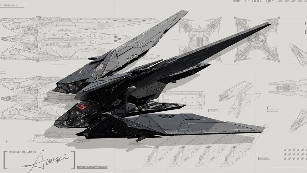 战舰设计方面,我们希望战舰尽可能考究、符合军事常识和逻辑。在接触了一些我们能力能够触达到的、有相关经验的美术设计同学后,我们多少感觉有些“艺术有余而工业不足”。而我们作为一个初创公司,资源有限,既不能到处打广告也花不起昂贵的猎头费用。所以我们决定自己扩大寻找面,在游戏行业外找一找。幸运的是我们找到了这位并不在游戏行业工作的工学博士,他是硬表面设计的狂热爱好者。而他做出的战舰设计也果然没有让项目同学失望,兼顾工业逻辑和设计美感。由于日本留学的经历,我们会开玩笑说他“弃工从游”。下面是他为《代号Space》做的一些设计: