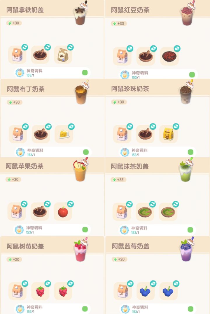 本次联动一共是八大奶茶,食谱和限定牛乳需要去文艺街旁的快闪店购买哦,其它食材需找马西莫购买或采摘哦~