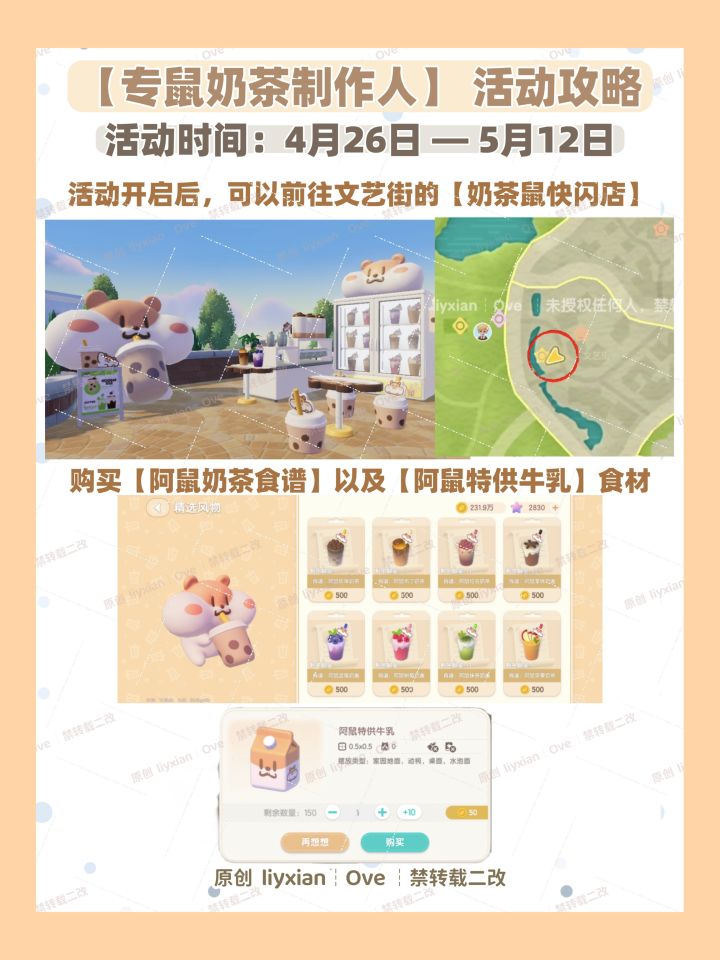 活动开启后,可以前往文艺街的【奶茶鼠快闪店】购买【阿鼠奶茶食谱】以及【阿鼠特供牛乳】食材。