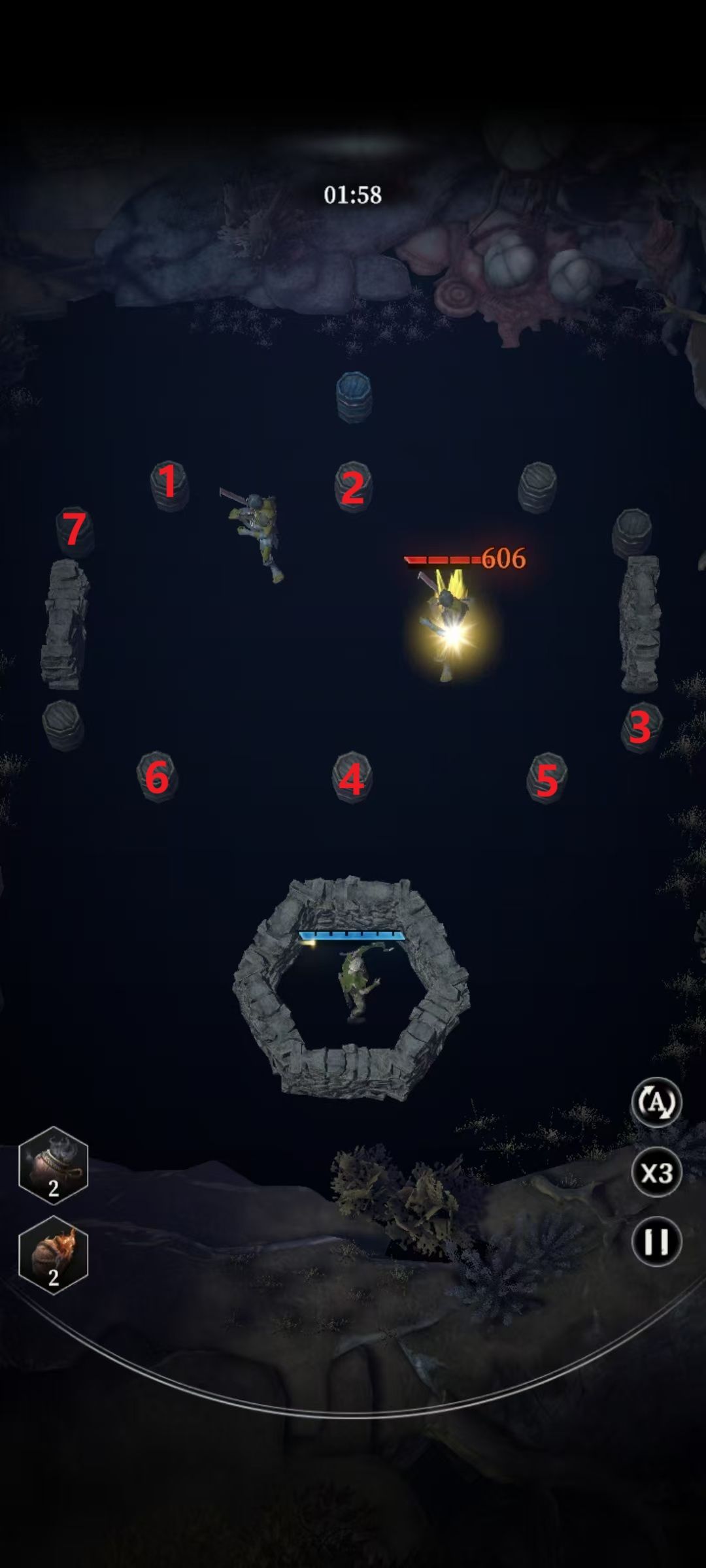 点桶顺序,1桶开口,2桶防备怪物走右边,把它回弹到3,4桶那边。