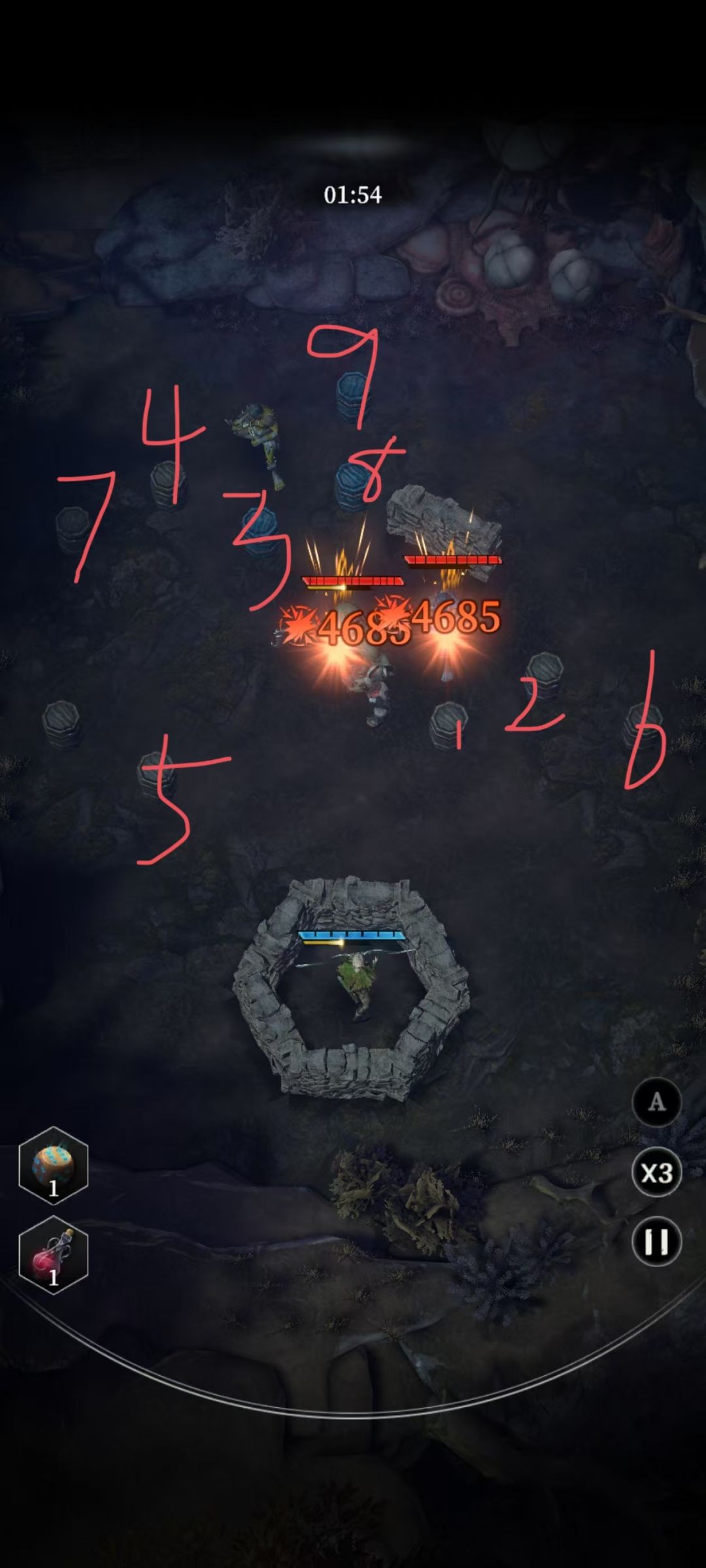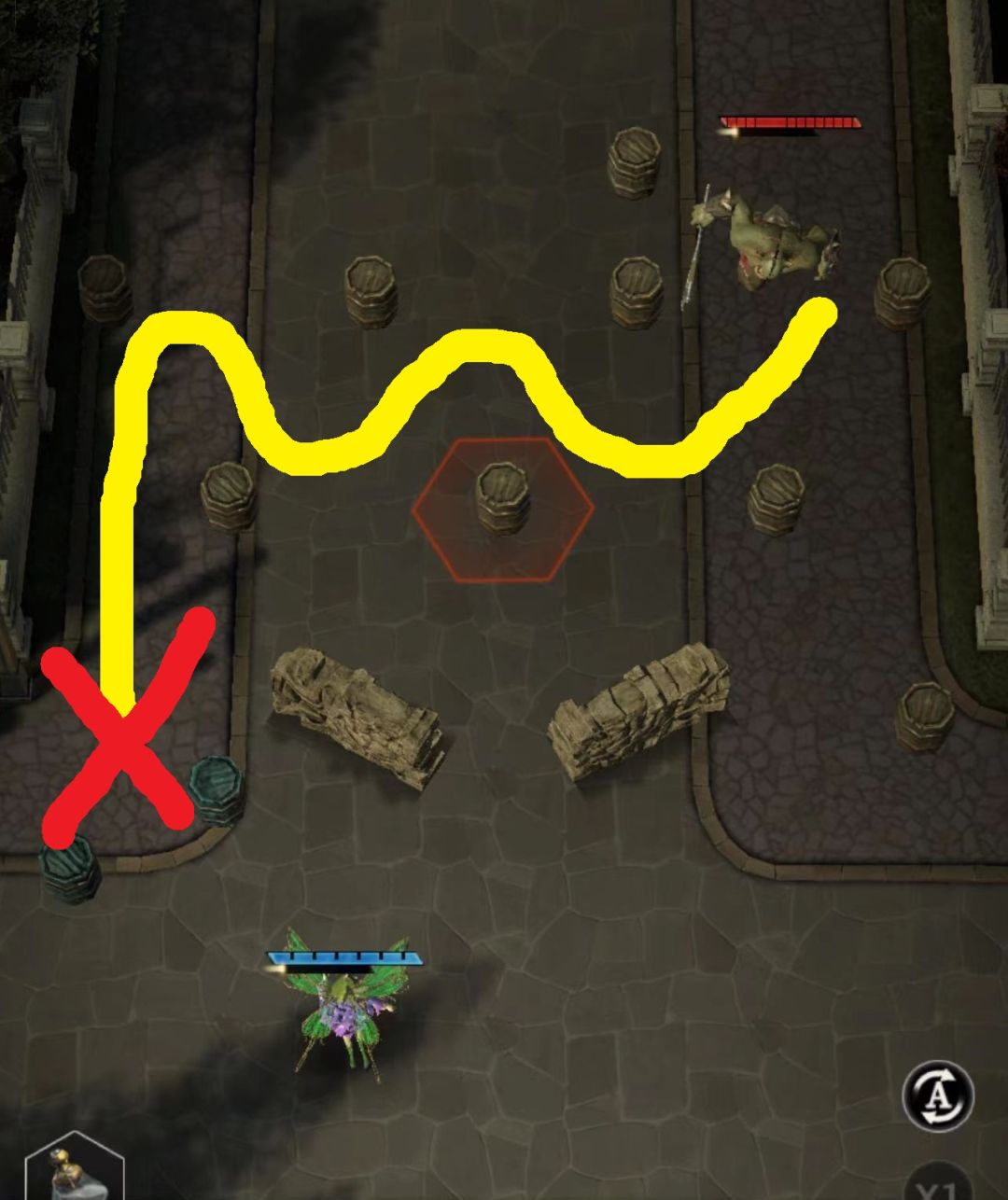 3:远程+近战,远程站位随意,近战注意脚程刚好头目走到3桶附近顶住它。(黑点)
