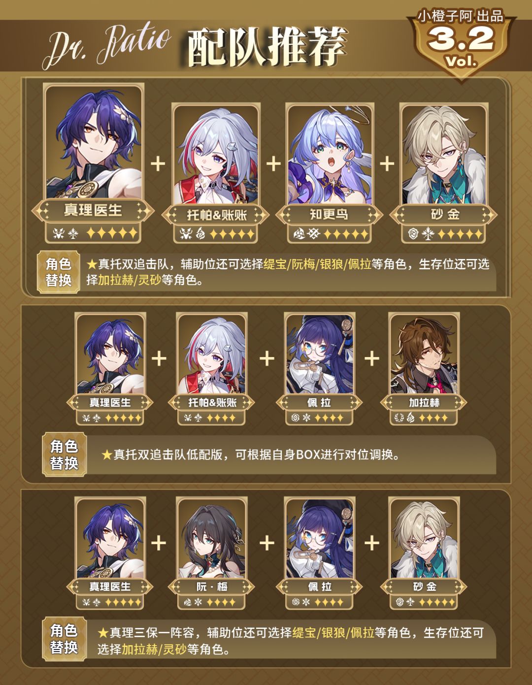 因此需要搭配能多挂负面状态的角色进行配队,例如辅助银狼、佩拉,生存砂金、加拉赫、灵砂,以及同样为追击的托帕,这样可以发挥真理医生最大的收益。