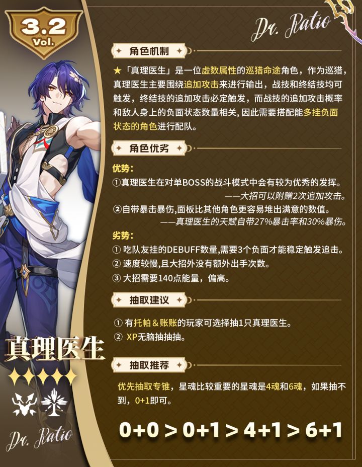 「真理医生」是一位虚数属性的巡猎命途角色,作为巡猎,真理医生主要围绕追加攻击来进行输出,战技和终结技均可触发,终结技的追加攻击必定触发,而战技的追加攻击概率和敌人身上的负面状态数量相关。