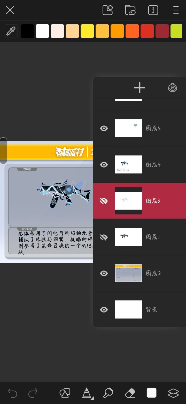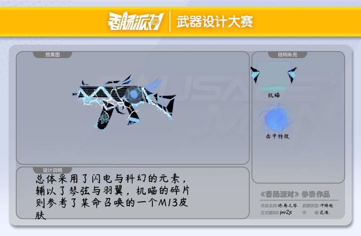 设计灵感:总体采用了闪电与科幻元素,羽翼和琴弦是一点小创意,机瞄是参考了某某召唤的一个皮肤