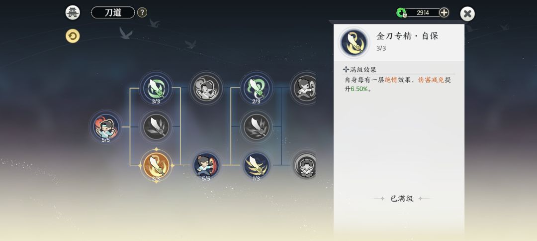 3.天赋方面点满金刀绝情、刀伤,可以点两点木刀精通保命