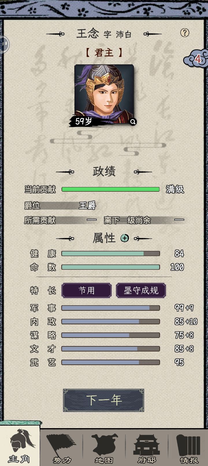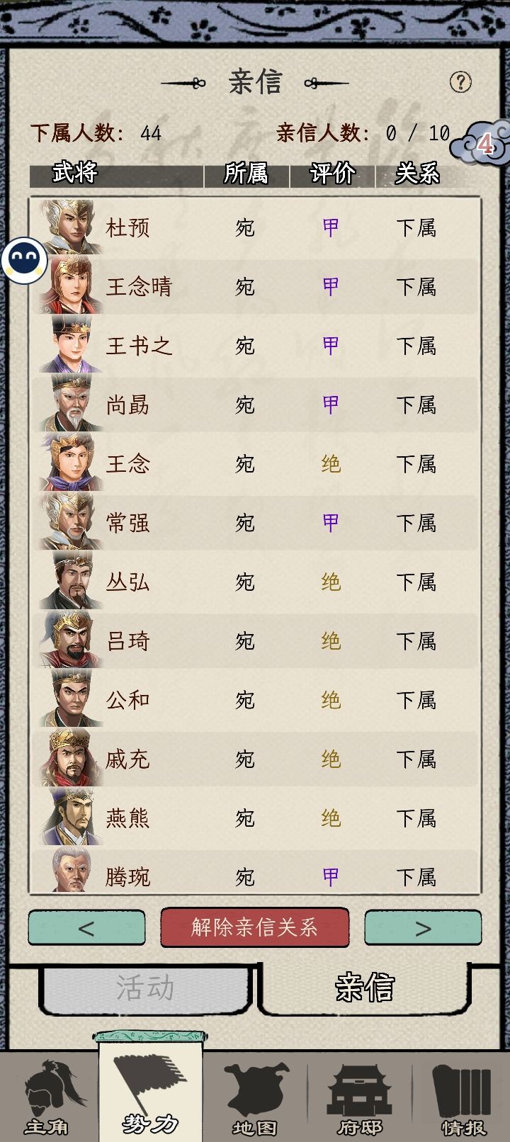 到了后期就好玩了不要管其他只要去(剿匪)和(演武)你不比武尽量不比,尽量不自己出手让手下打(因为你出手会吊健康值)。然后升到2品看情况自立。尽可能找一个打嘴炮比较厉害,你自立会反对拿个减少损失。