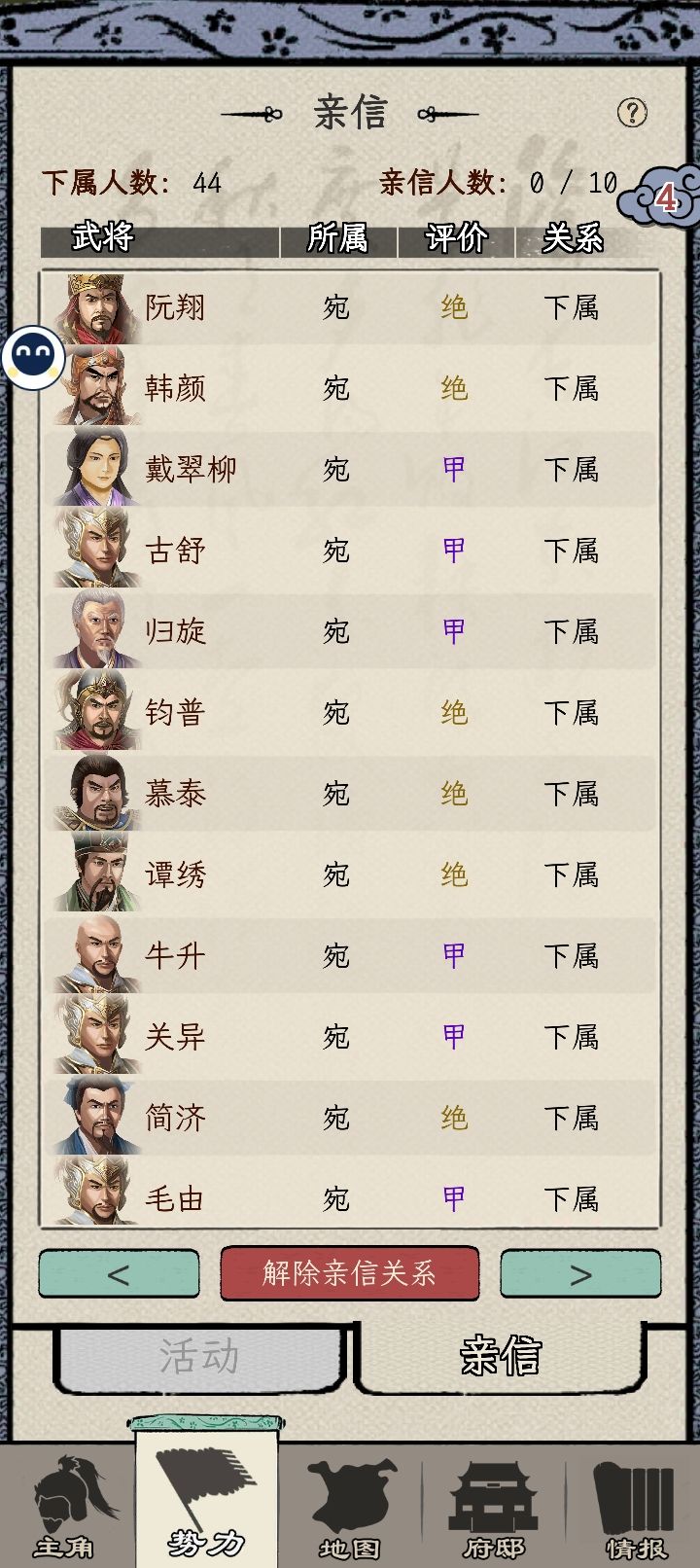 开局不要浪费时间直接就一直在酒馆做有资金的任务。一直搞宴会尽可能早的拉满60然后再选2个武将前期过任务。最好是选领地少的。“丁”级是不要送东西的直接拉2个免费的。(开局一直做任务宴会坑定能拉满实在没满就看两个广告)。前期尽可能多拿资金过。