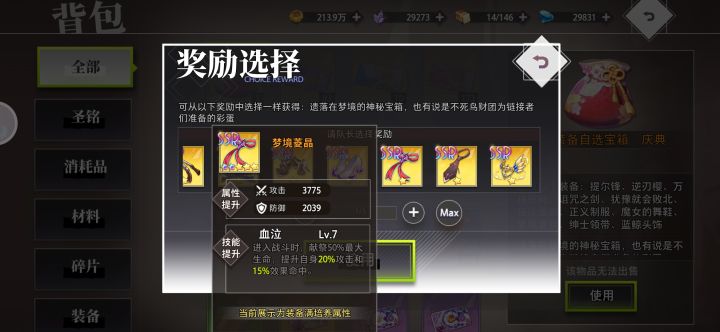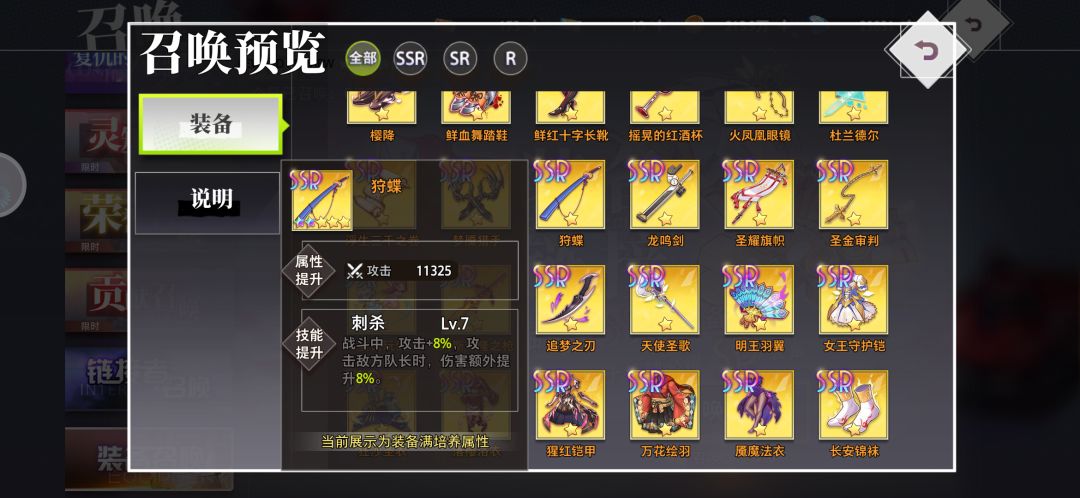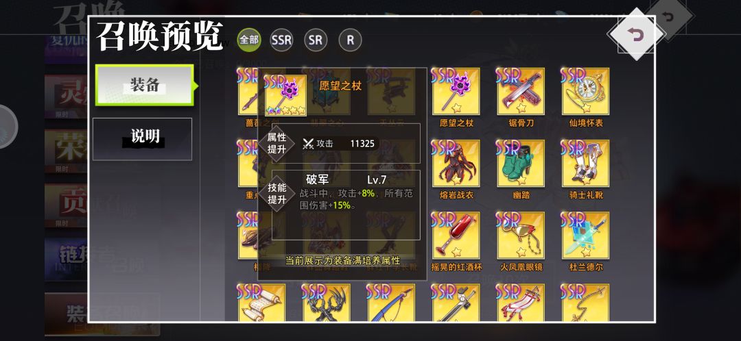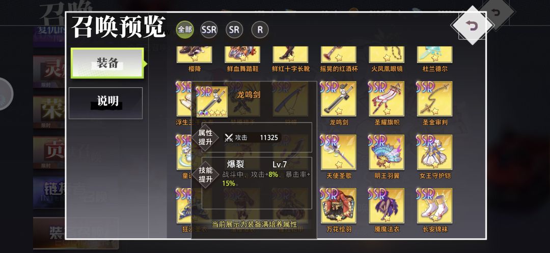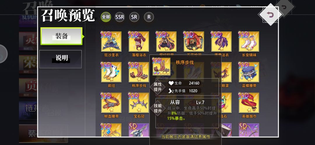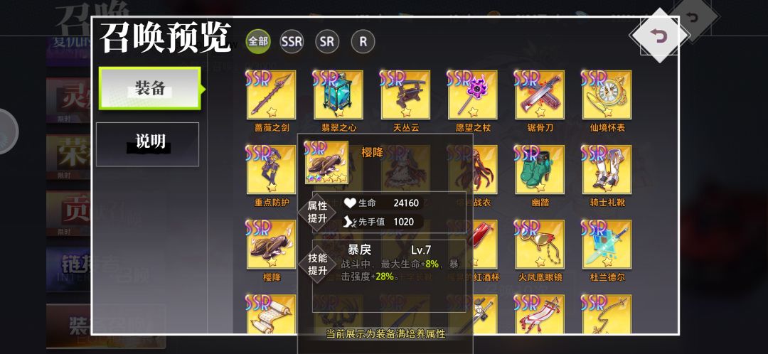 首先,大家可以从装备召唤(武器池)里预览一下ssr装备,基本上日常爆的装备都能在这里面看到,由于ssr装备获取难度不低(氪佬另说),装备的等级突破是需要本体或者荣耀宝石的(商店兑换),宝石的获取渠道也比较少,建议留着给关键装备,因此在ssr本体不多的情况下,优先用sr去过度,不用在意装备的效果,等级优先,30级的sr属性就比20的ssr高了。前期尽量升武器,其次是饰品,都是可以加输出的,很多关卡秒不死boss,就会发现召唤出来一队人,很恶心,所以尽量提高输出秒boss,还能拿3星#梦的第七章