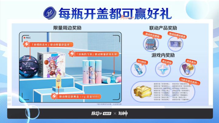 活动期间,玩家登录游戏,参与各类玩法即可获取积分,用于兑换原石、脉动饮料、限定周边抽奖券等丰富奖励。线下,多款联动脉动饮品闪亮登场。每瓶联动脉动都可开盖扫码抽奖,玩家有机会抽取联动限定黄金,奖品十分诱人。此外,饮品采用了独特的冰镇隐藏设计包装,饮用冰镇脉动饮品时,还能开启“元素视野”彩蛋,巧妙融合游戏元素,带来新奇体验。
