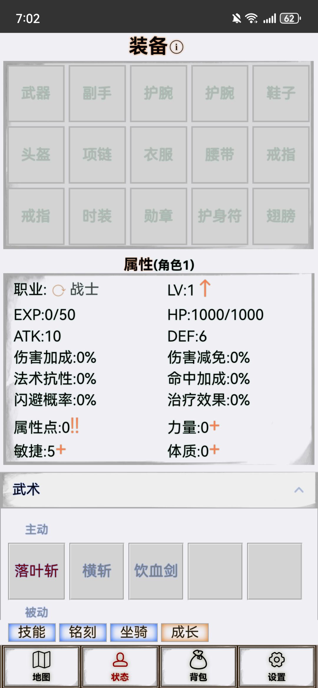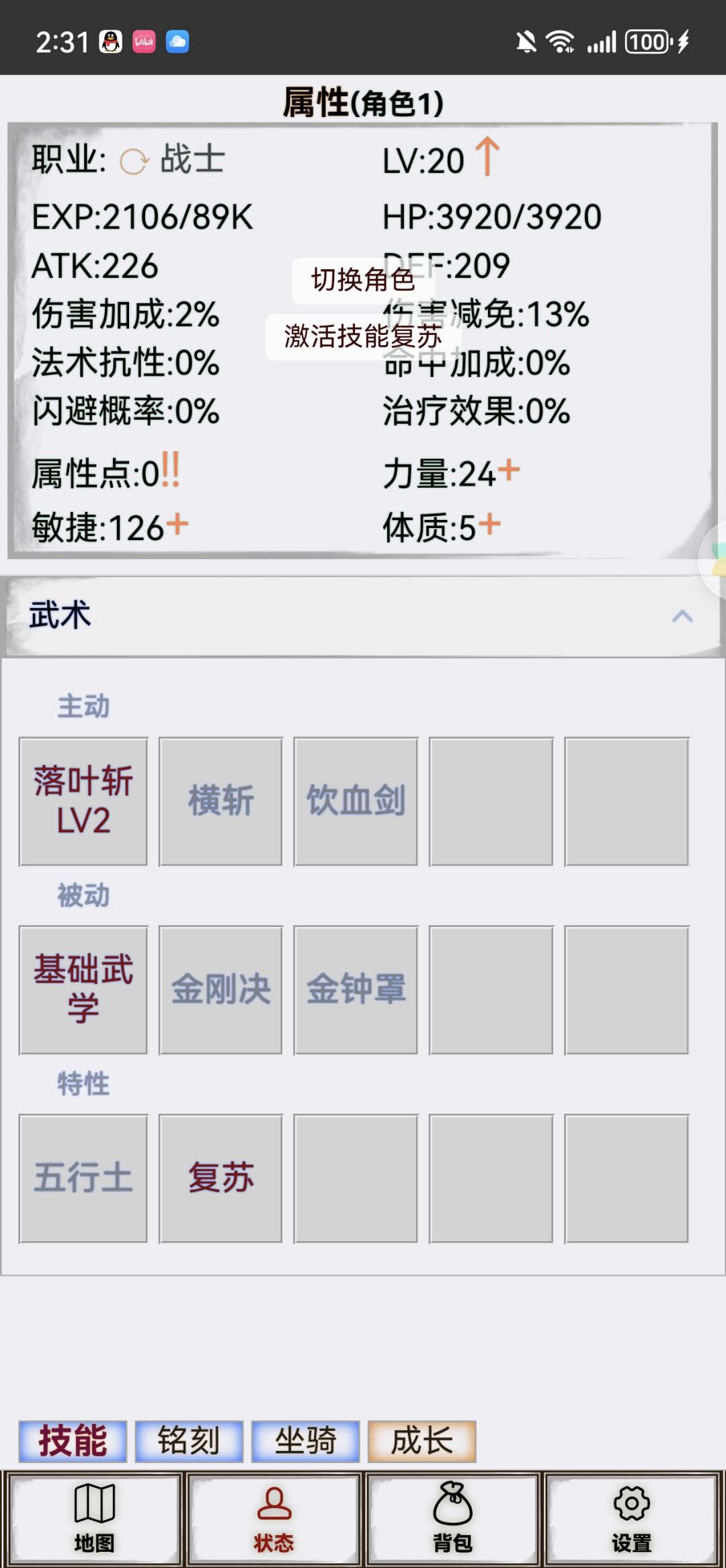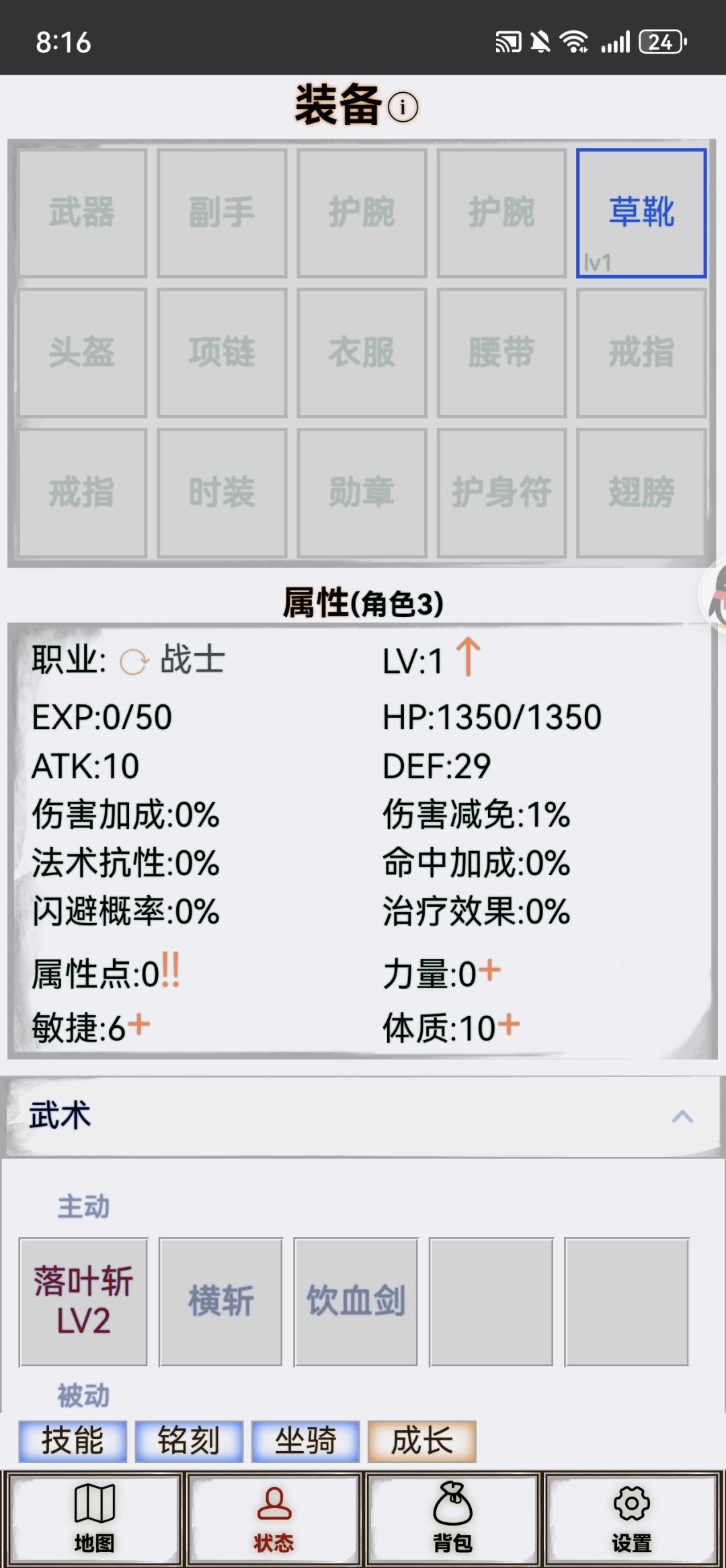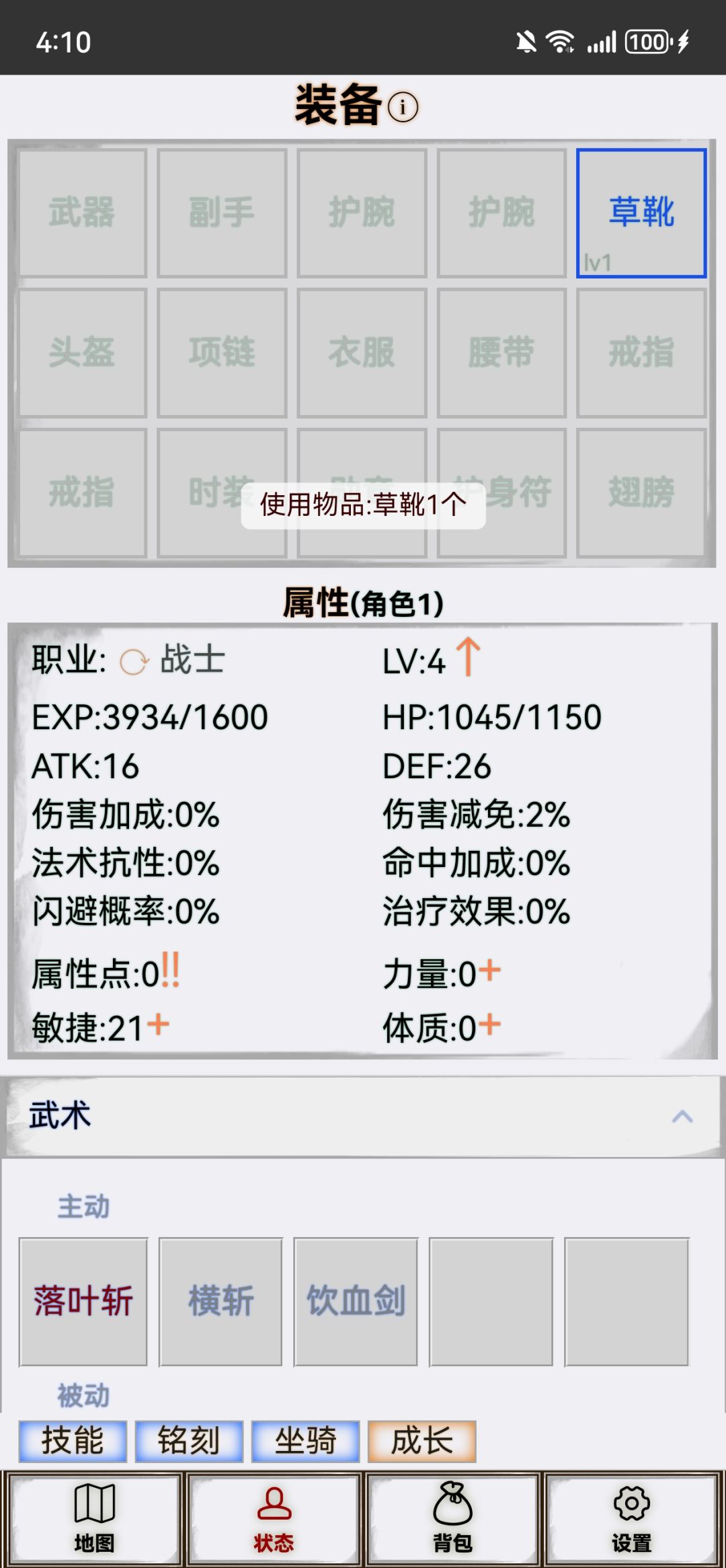 1)打开角色面板,选择战士职业,属性加点全部点敏捷,使用背包里的落叶斩,在角色界面点击落叶斩进行激活。