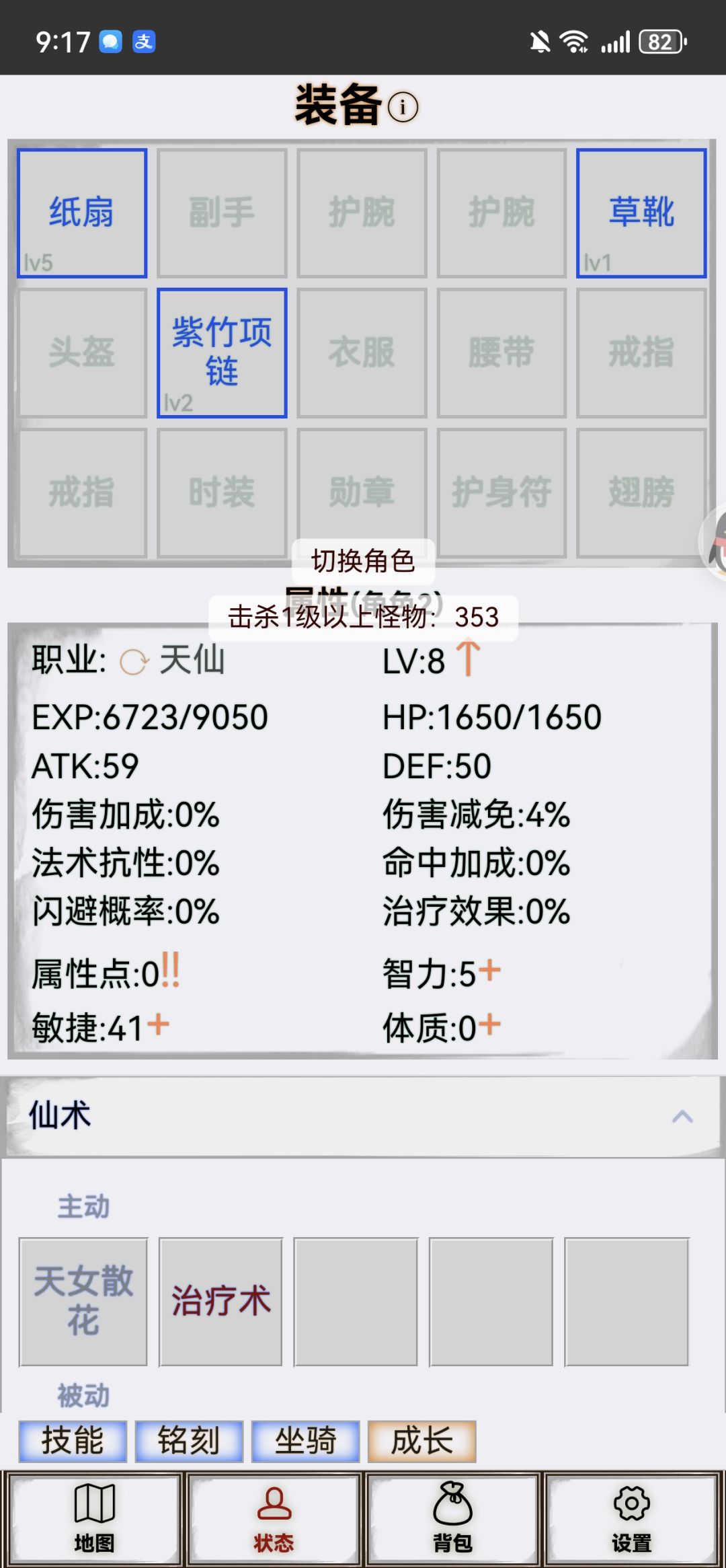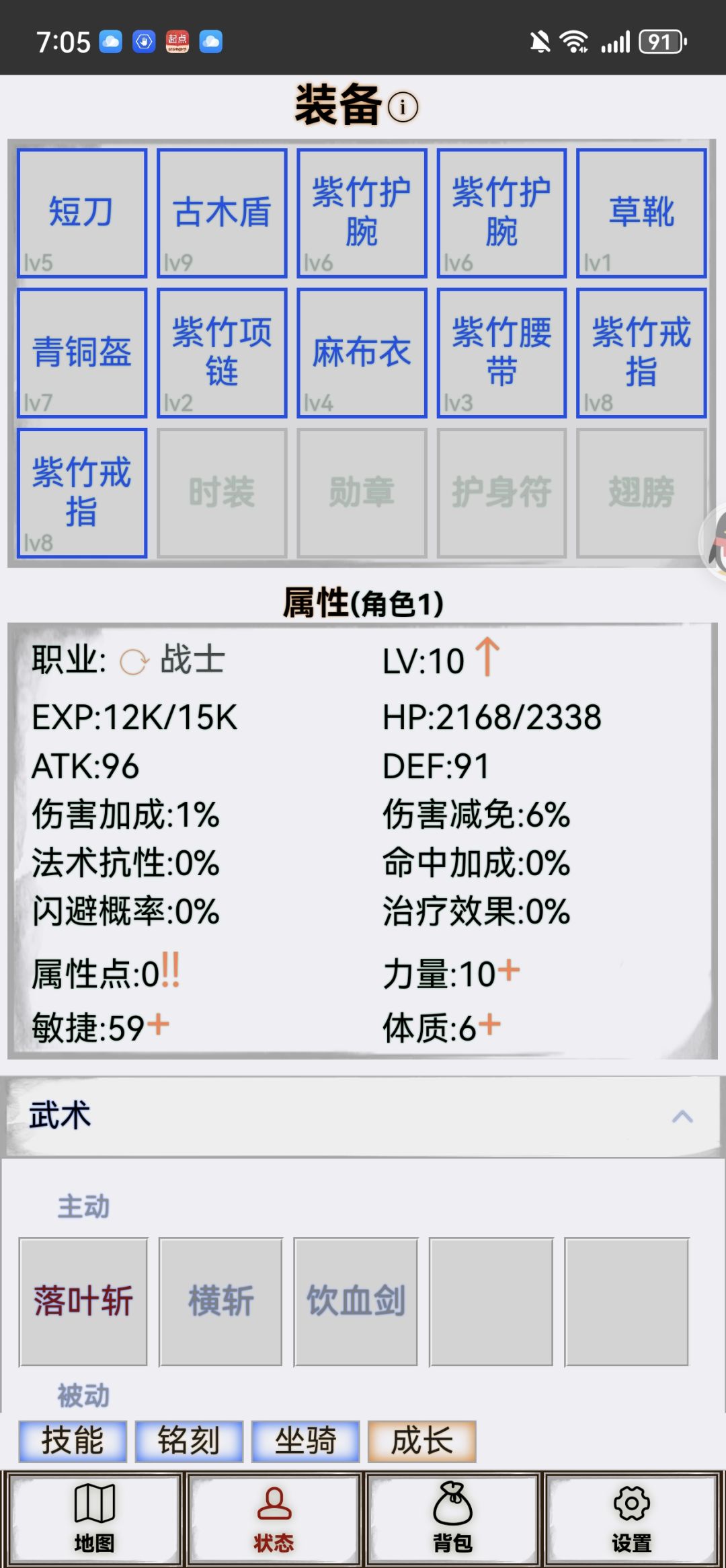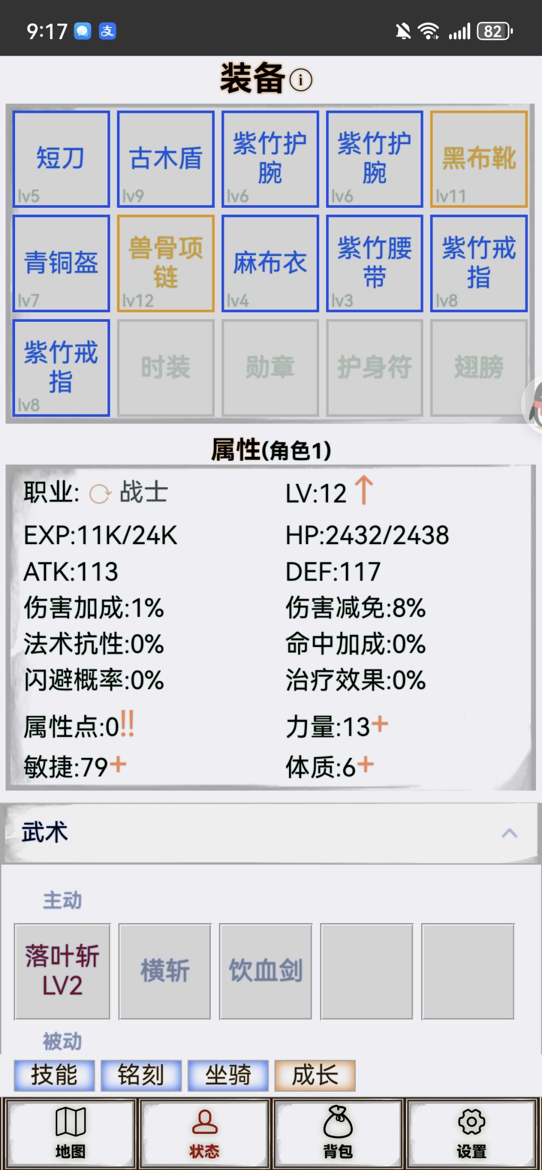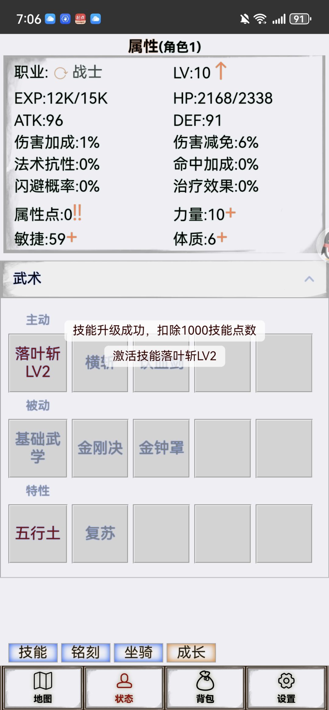 1)打开角色面板,选择战士职业,属性加点全部点敏捷,使用背包里的落叶斩,在角色界面点击落叶斩进行激活。