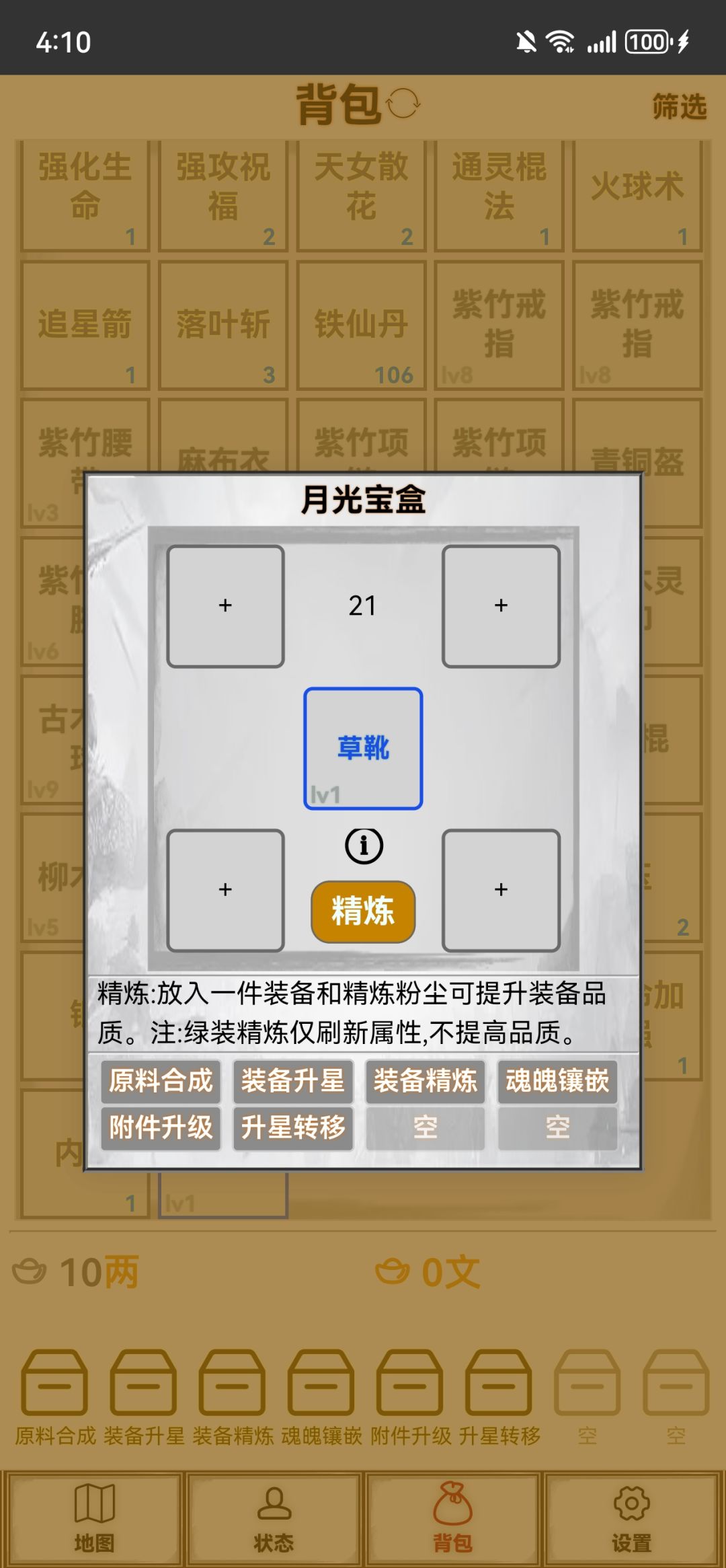 记得买上几瓶净化药水(也是在杂货铺),新手刷强化还是太吃力了,新手期如果打着打着变成强化变异,会打得非常慢,吃一瓶净化药水可以让地图变异值归零。
