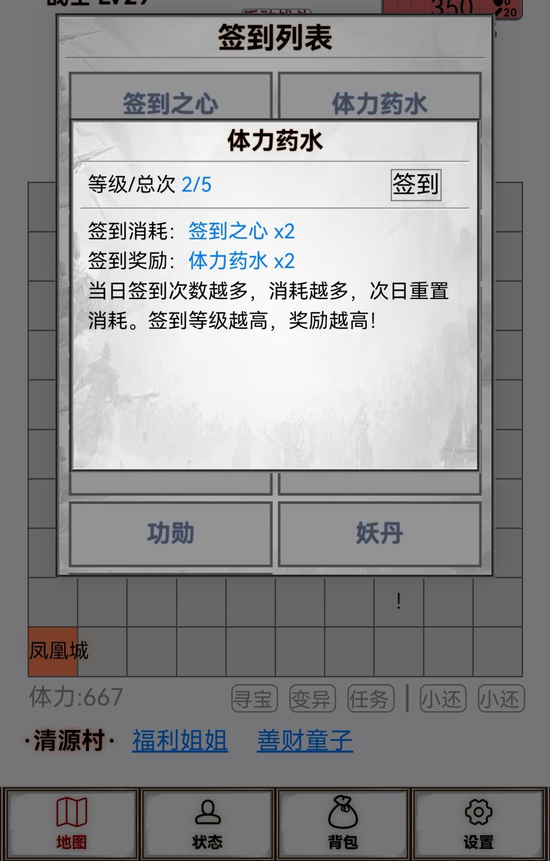 6)善财童子领银两,福利姐姐签到体力药水(5次),过渡完新手期以后,第二个目标是70级白骨洞,因此现阶段全部签体力药水即可,需要大量体力来提高升级速度。