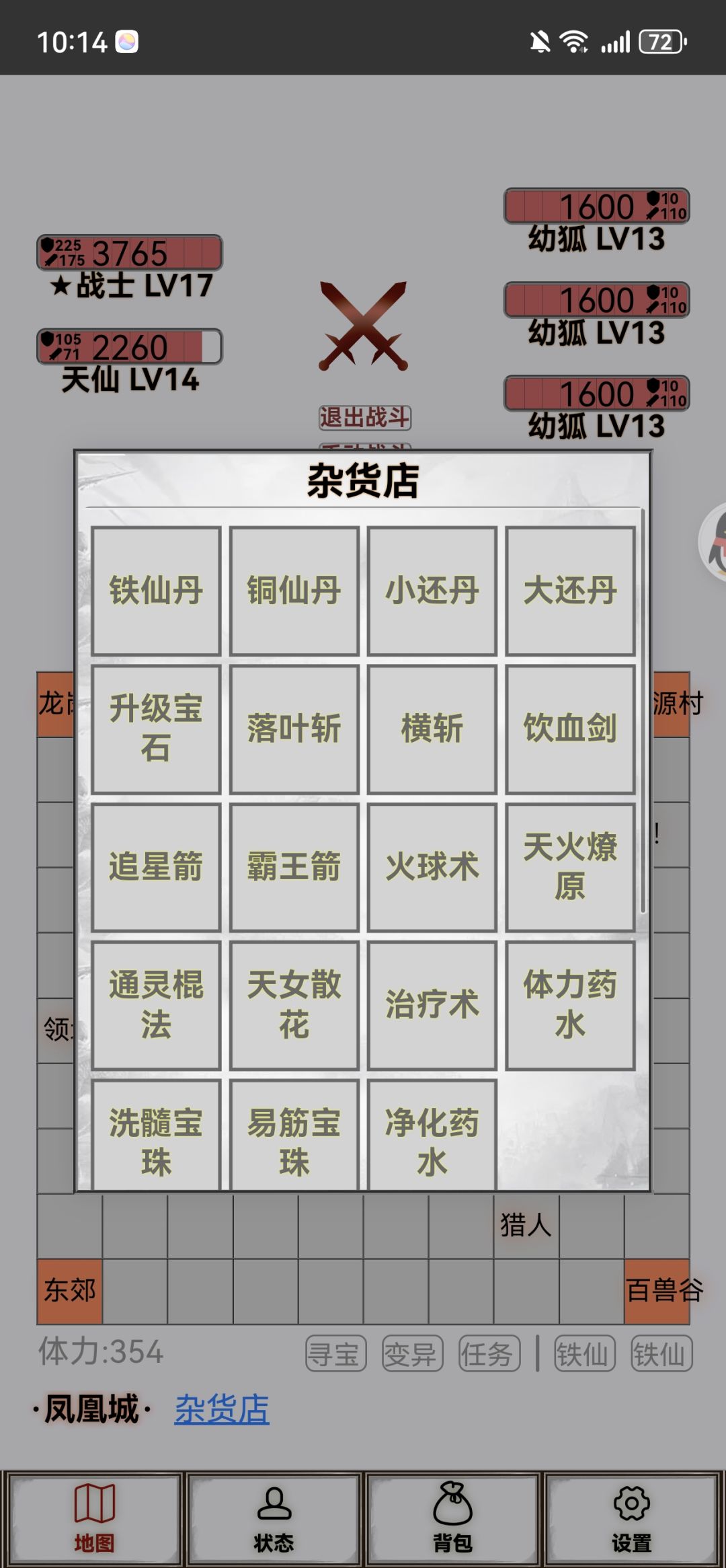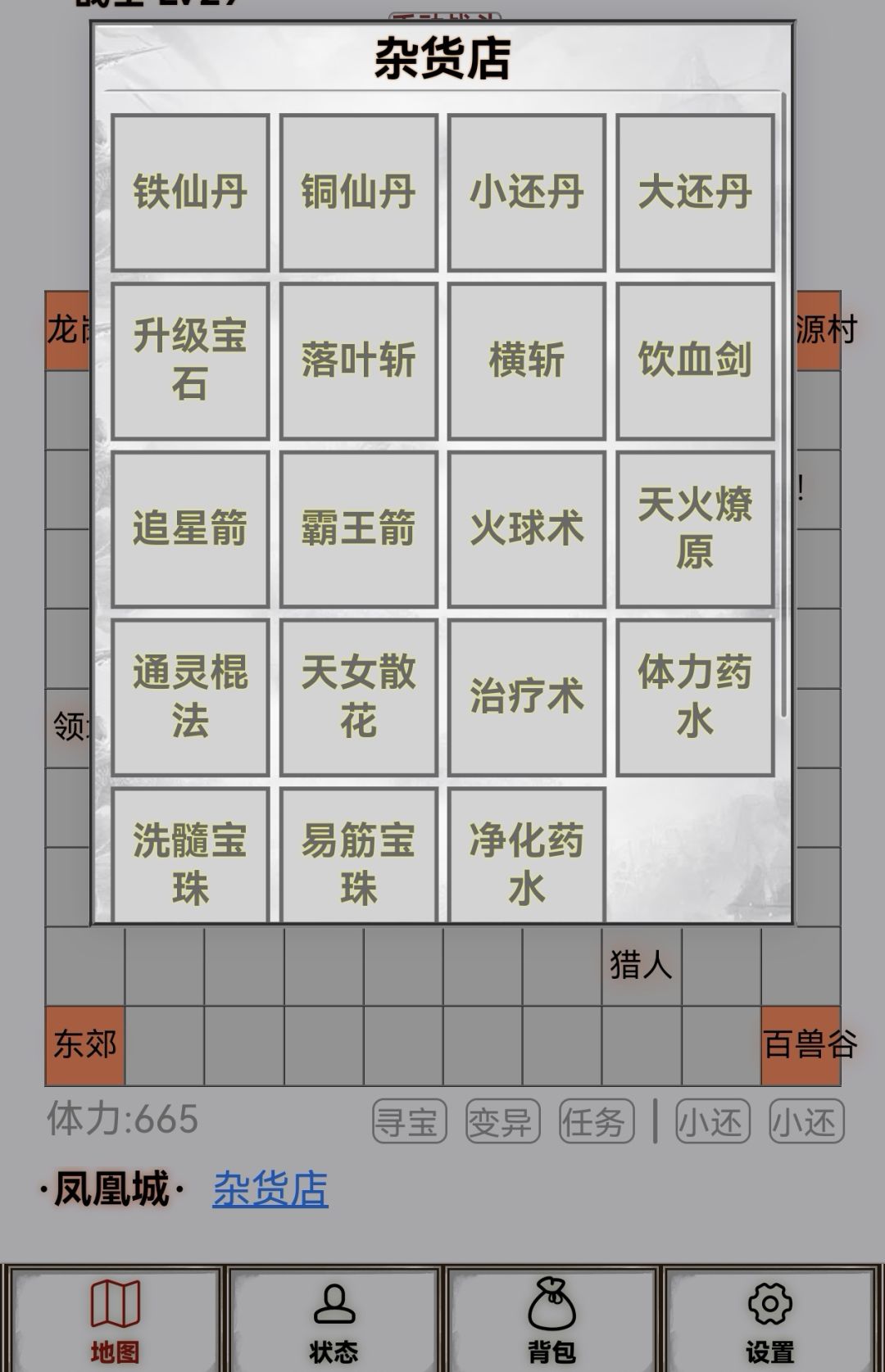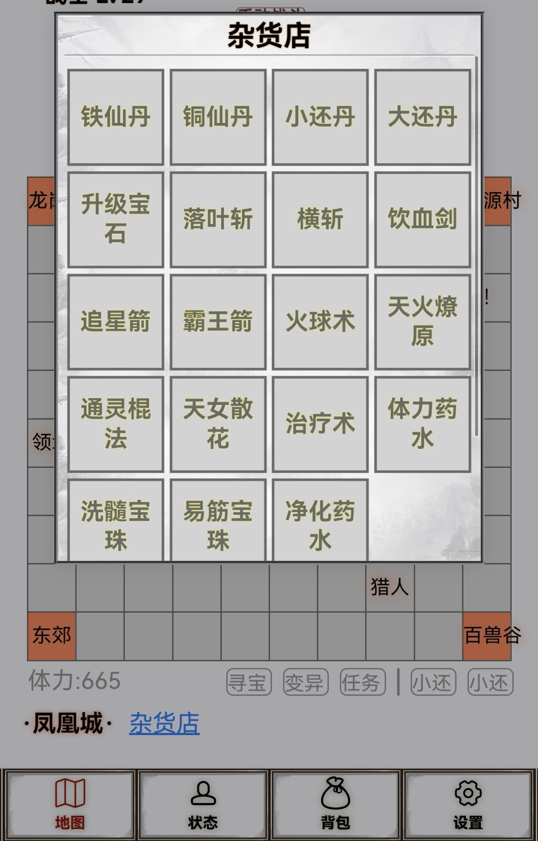 查看一下背包中的两种丹药数量,那种多就用那种,若两种数量都少于50了,就在杂货店里买一些,有100-200颗足够了,哪种都行,补充完丹药再出发去百兽谷。
