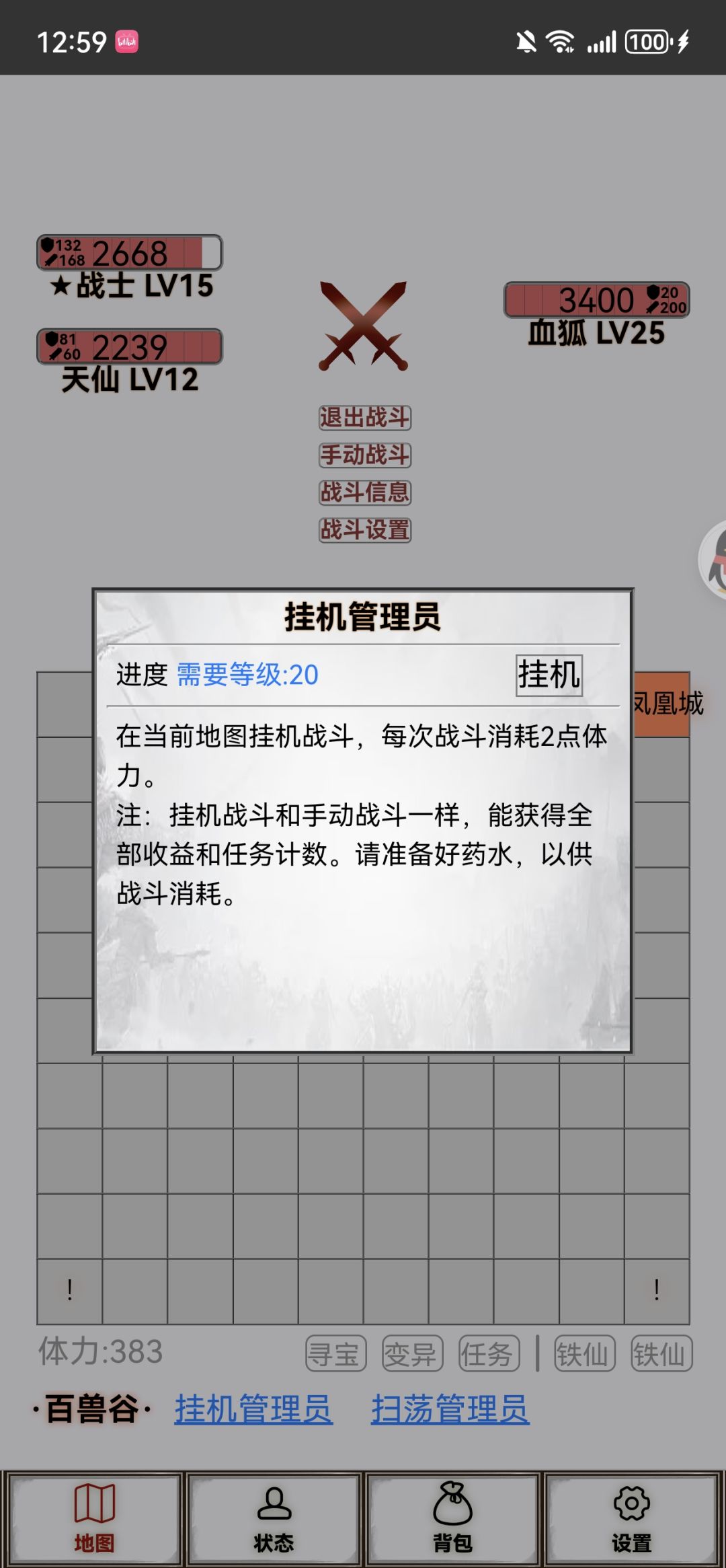 本游戏分手动战斗,自动战斗和挂机战斗,每次战斗都消耗2体力,怪物数量前期在1-5之间随机(后续可升级寻怪上下限使怪物数量变化)。