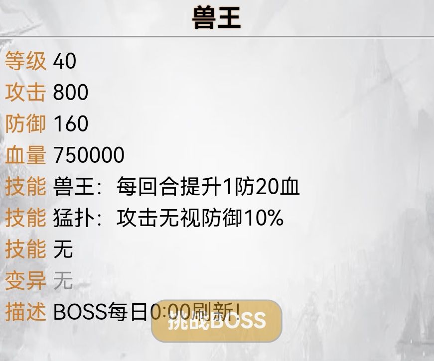 4)最特殊的地方,百兽谷的两只BOSS都是绿色品质的,查看属性会发现特别夸张,而且还自带每回合的属性增长,如果在挂机过程中遭遇,直接逃跑,不要犹豫,绿色BOSS的强度十分夸张,20级角色和他们的属性差距完全无法抹平。但是在后续的练级过程中,绿色BOSS是十分重要的资源,在详解里会详细叙述。