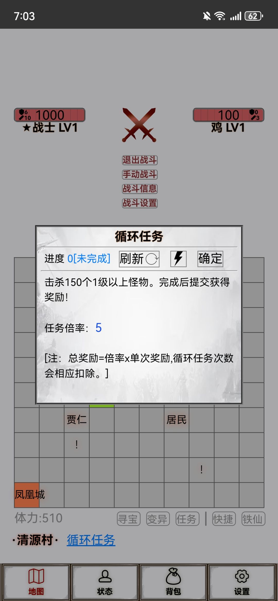 一级时刷新只要30文,开局有村长送的10两,可以刷33次,一般刷不超过5次就能刷到刷怪任务了。四种任务中,谈话任务的NPC在下一张图,完全无法完成,提交内丹任务要去打BOSS,1级角色打BOSS不太现实,提交物品任务则是因为物品的掉率其实并不算高,以新手村地图为例,单倍率的提交物品任务是15个肉块,但是因为爆率原因要打几十只甚至上百只小怪才能凑齐,非常麻烦,而单倍率的打怪任务只要打30只,速度快奖励还好。