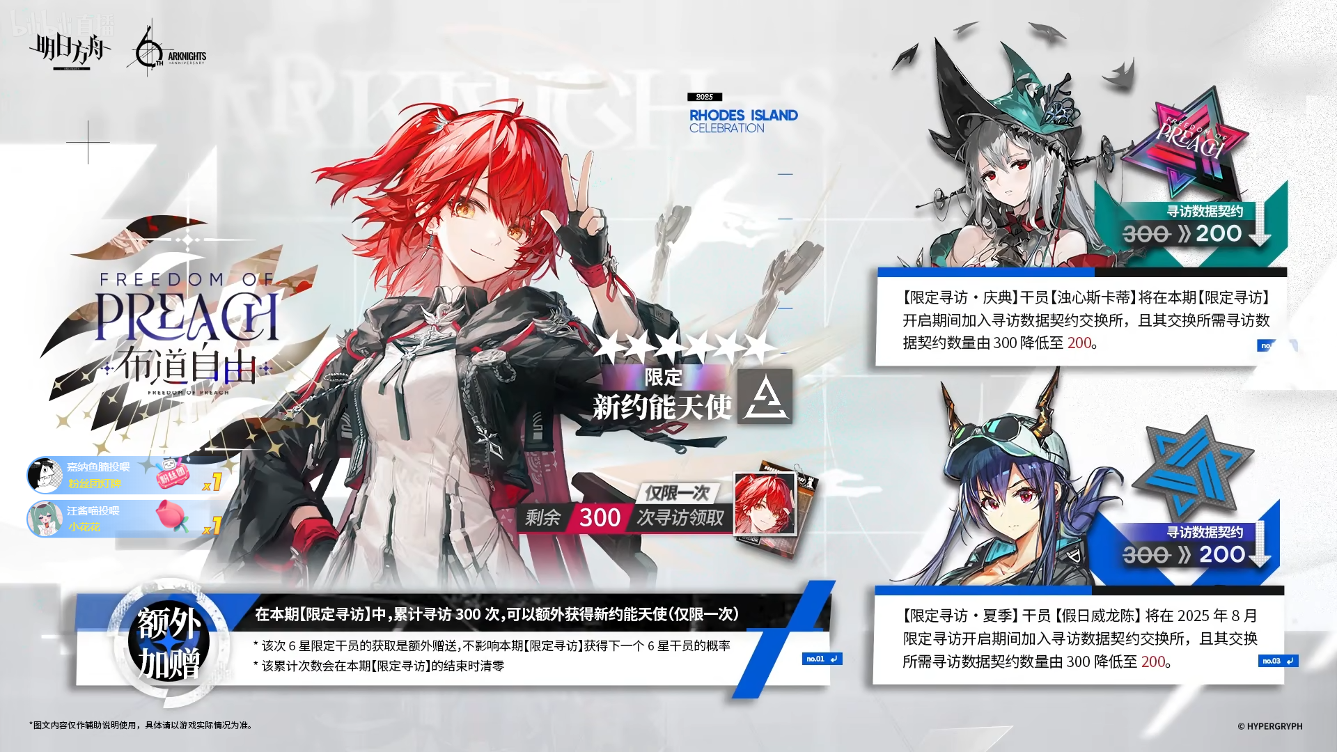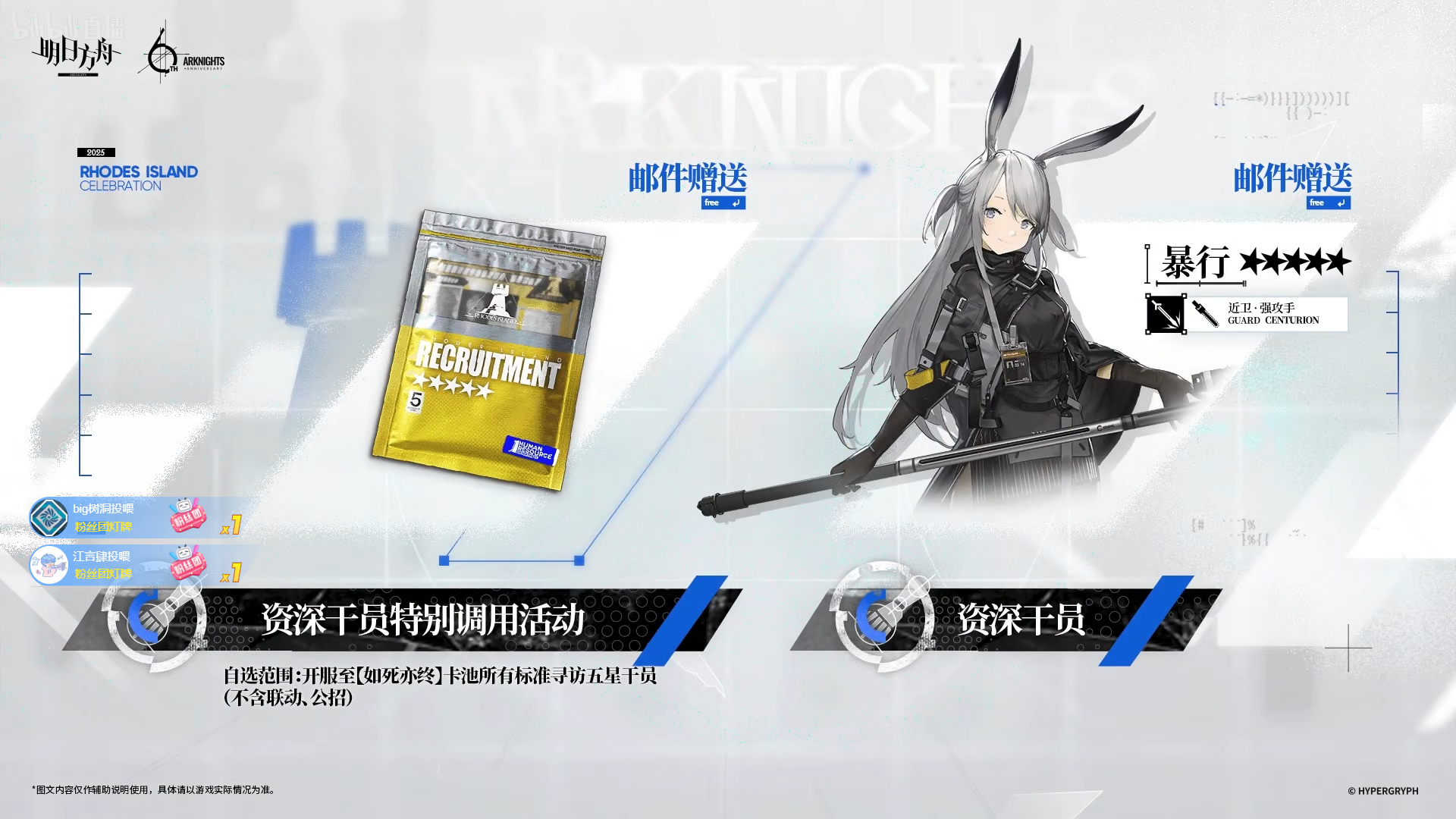 版本更新后,每位玩家都可以领取一份资深干员调用券以及五星干员暴行一只,此外,本次限定寻访兑换中,干员浊心斯卡蒂降为200抽即可换取,同时,我们的老陈也会在今年夏活中降为200抽即可换取