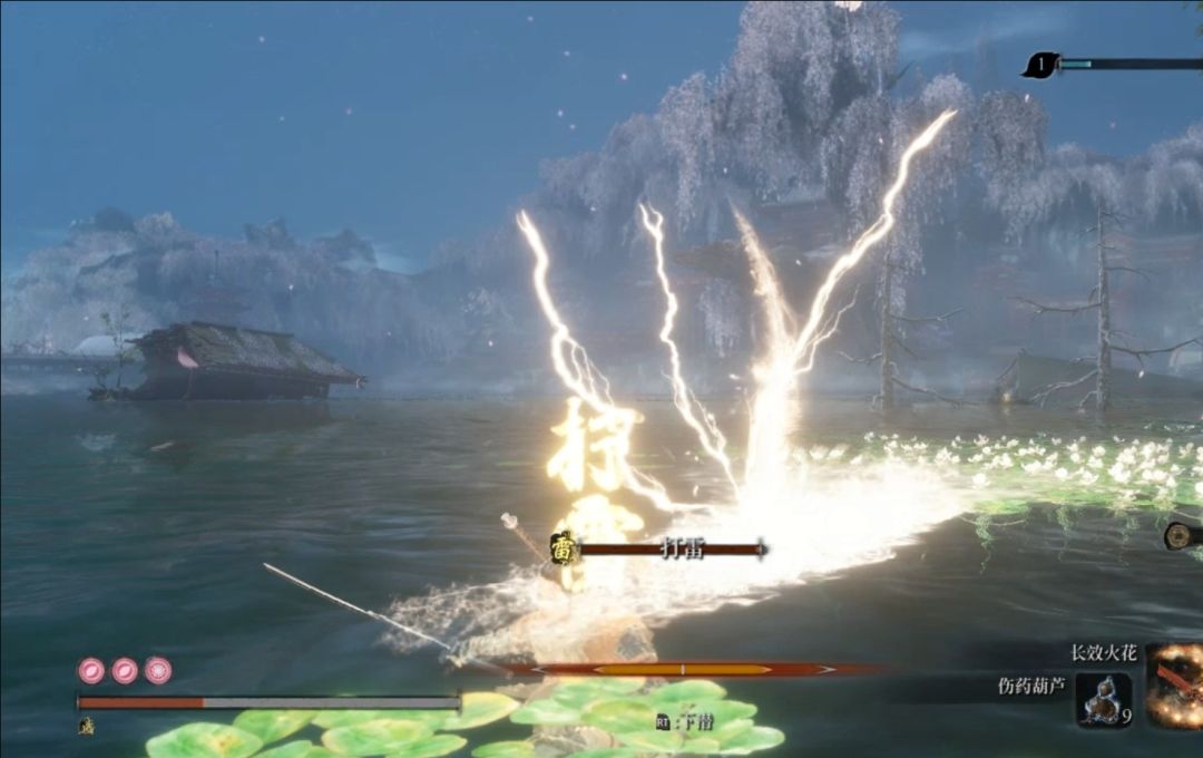 从鬼佛处直接钩绳到树上,杀掉之前电我们的敌人。虽然这名BOSS有名有姓,但是没有近战攻击力,直接一套就带走了,杀掉之后获得佛珠。