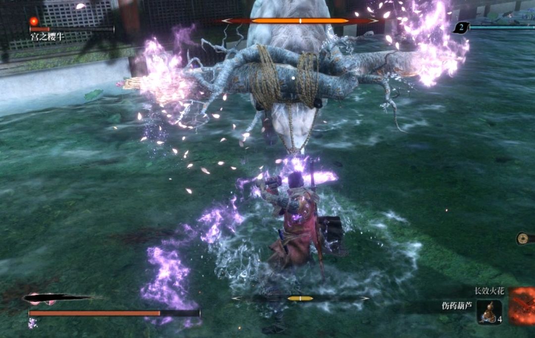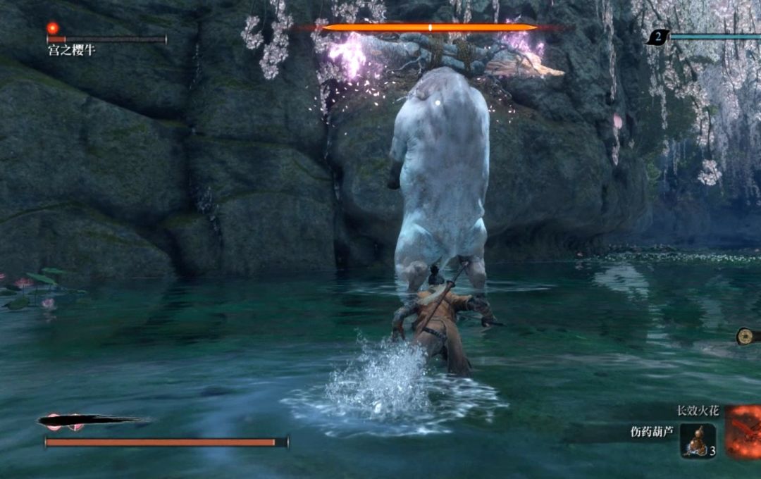 杀完第三个敌人后,会看到墙外的下方有一只宫之樱牛,我们拿出爆竹和神之飞雪,跳下去和他刚正面。