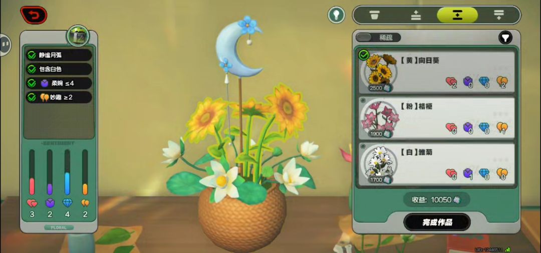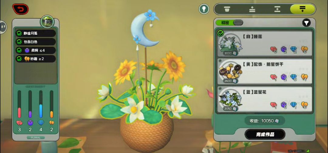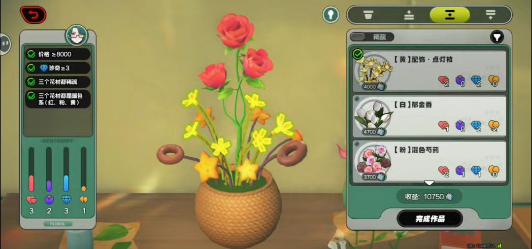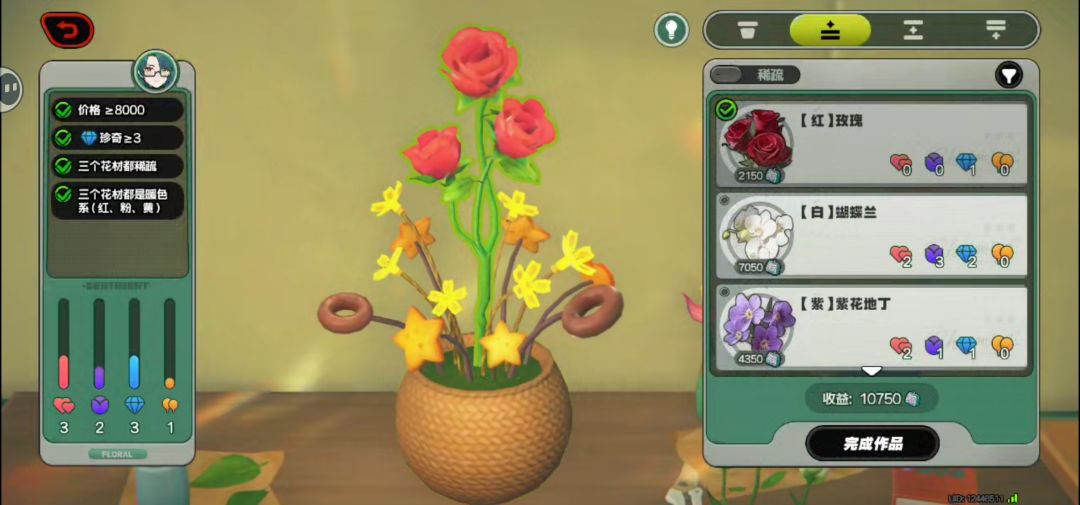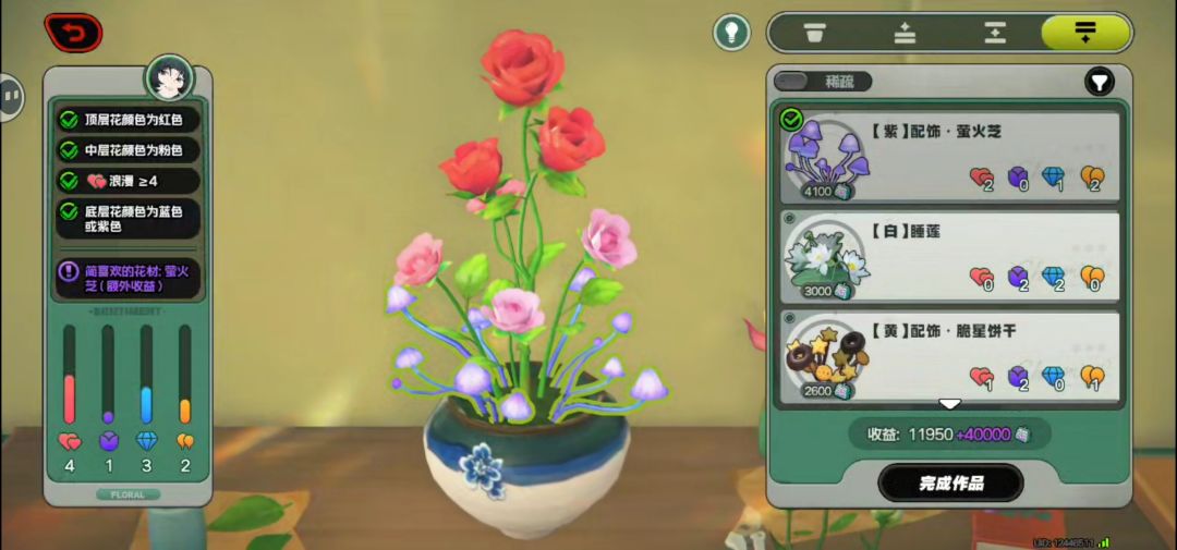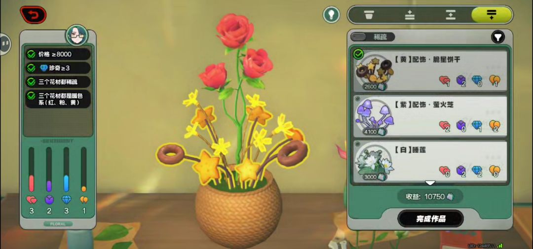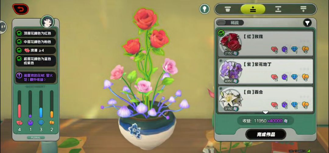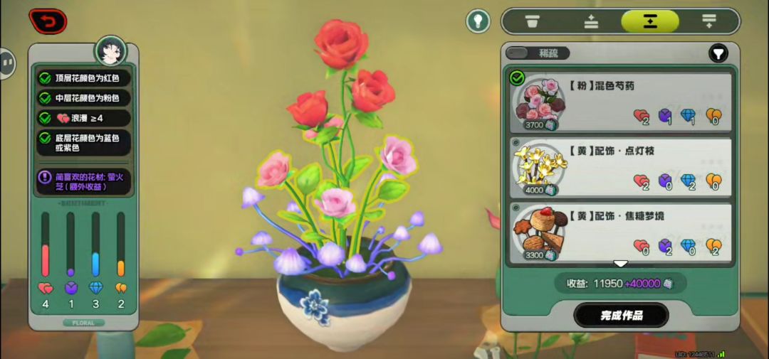 - 重复提交已解锁的高价配方(如玫瑰主题花束),挂机收益最大化。