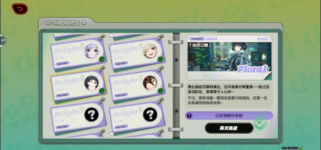 - 解锁全部10种花材组合可领取“菲林×1200”,营业额达88万后🎯解锁雨果专属剧情🎯。