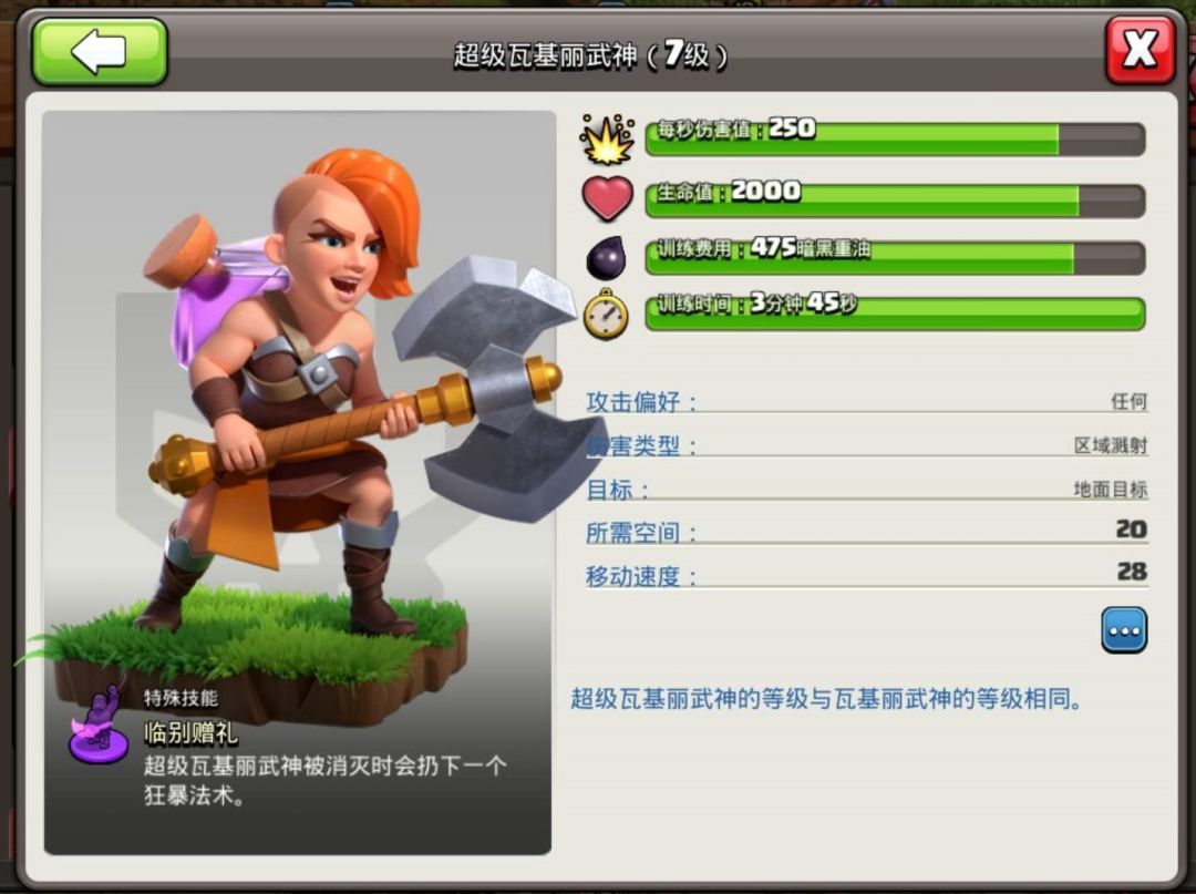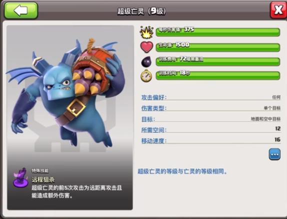 接下来我们看下超级亡灵的数据,首先是伤害提升到375点,这个伤害还是非常高的,要比气球和火龙强,血量也是提升到1500点,虽然血量有点低,没有办法抗住黑雷伤害,但是跟龙宝差不多,都是怕黑雷。