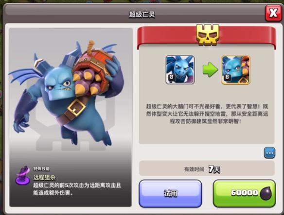 有超级亡灵这个兵种在部落战当中发挥的作用还是非常强,很多玩家也是在体验服测试带亡灵打13本,结局也是打出了完美三星,看到这样的数据要比龙宝好很多,毕竟部落战不能到几十个龙宝,带几十个亡灵还是没有问题的,在这次版本更新后,超级兵种没有冷却时间,超级炸弹人会成为热门,而第二个就有可能是超级亡灵。