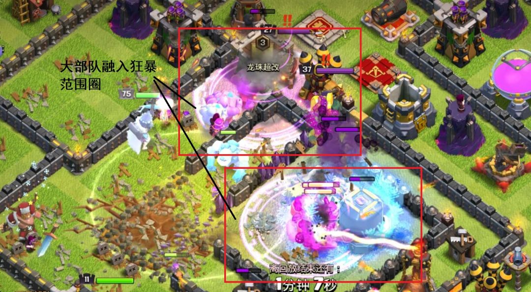 2)放出冰人,蛮王作为前排吸引火力,再依次放出剩下大部队兵种,咏王,飞盾英雄。由于超级武神始终在大部队之中,在毁灭后可为主力部队提供狂暴增益,为最终胜利提供有利条件。