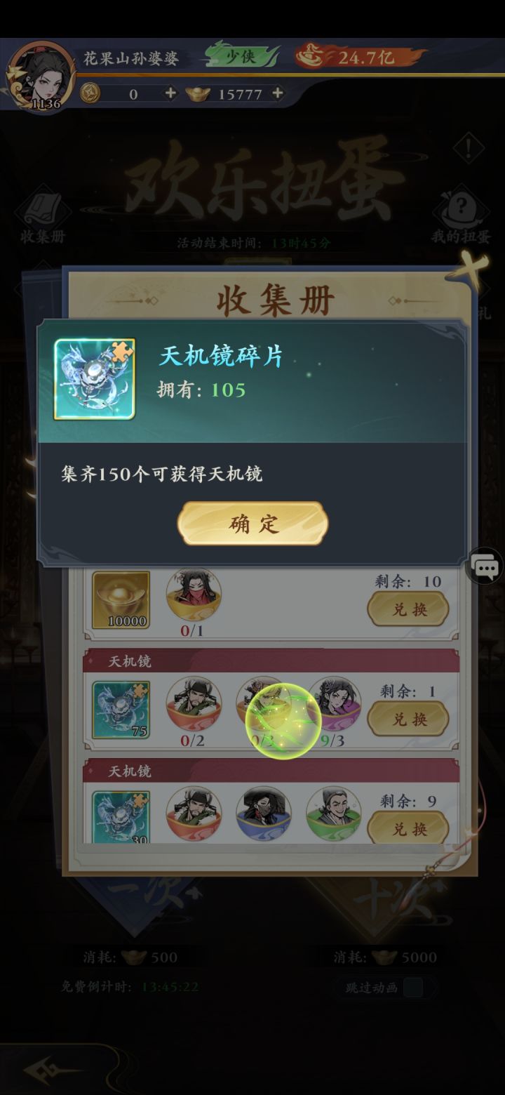 小号100多次,基本上不会亏元宝,还能小赚几千元宝。扭蛋最佳次数就是120次(出2个金蛋),前面2个金蛋开不出1~2万元宝也太黑了,2万4元宝进场,亏损不会超过5000元宝,多抽了10次,白换100多无双宝物碎片美滋滋