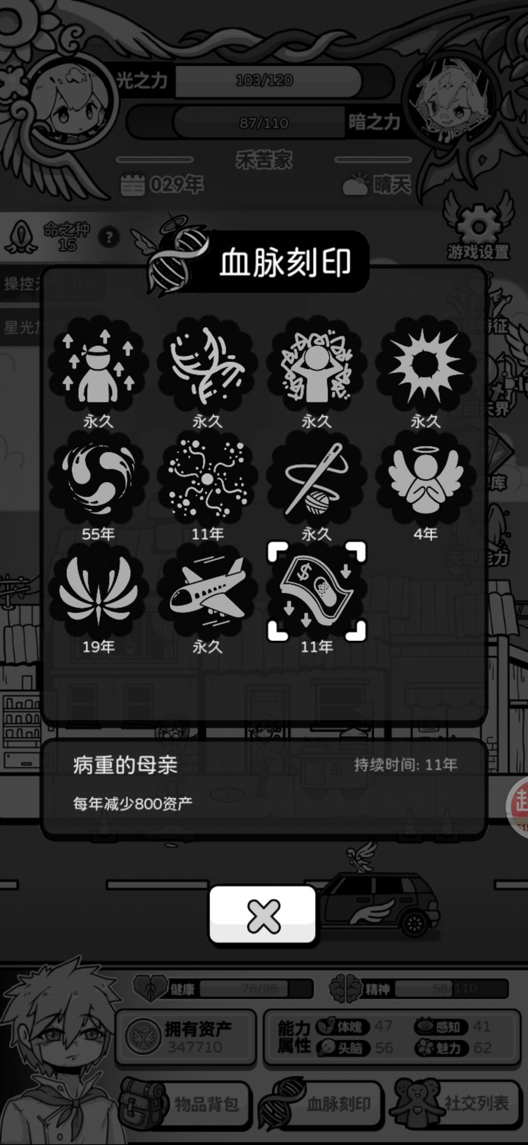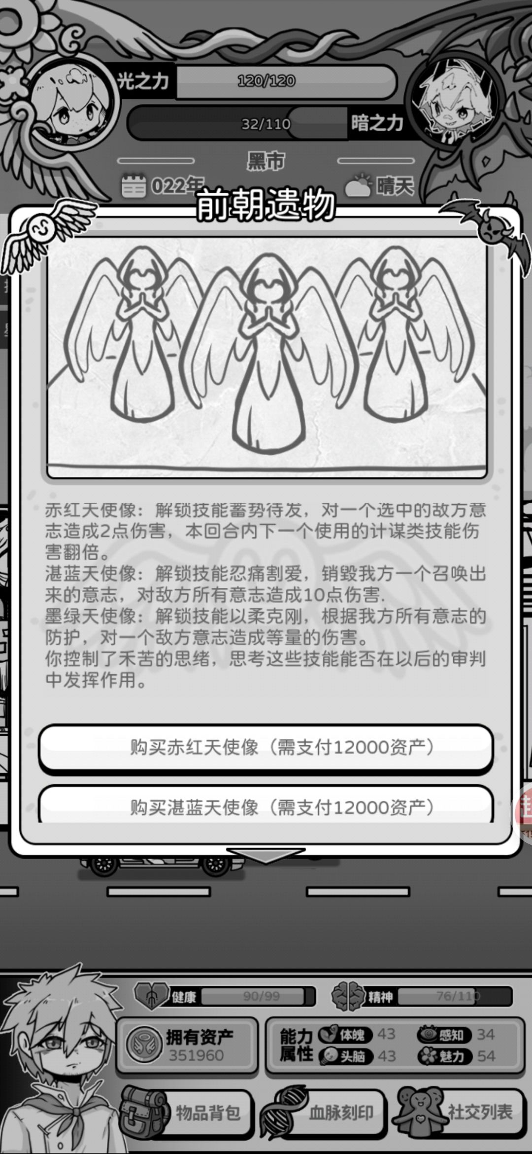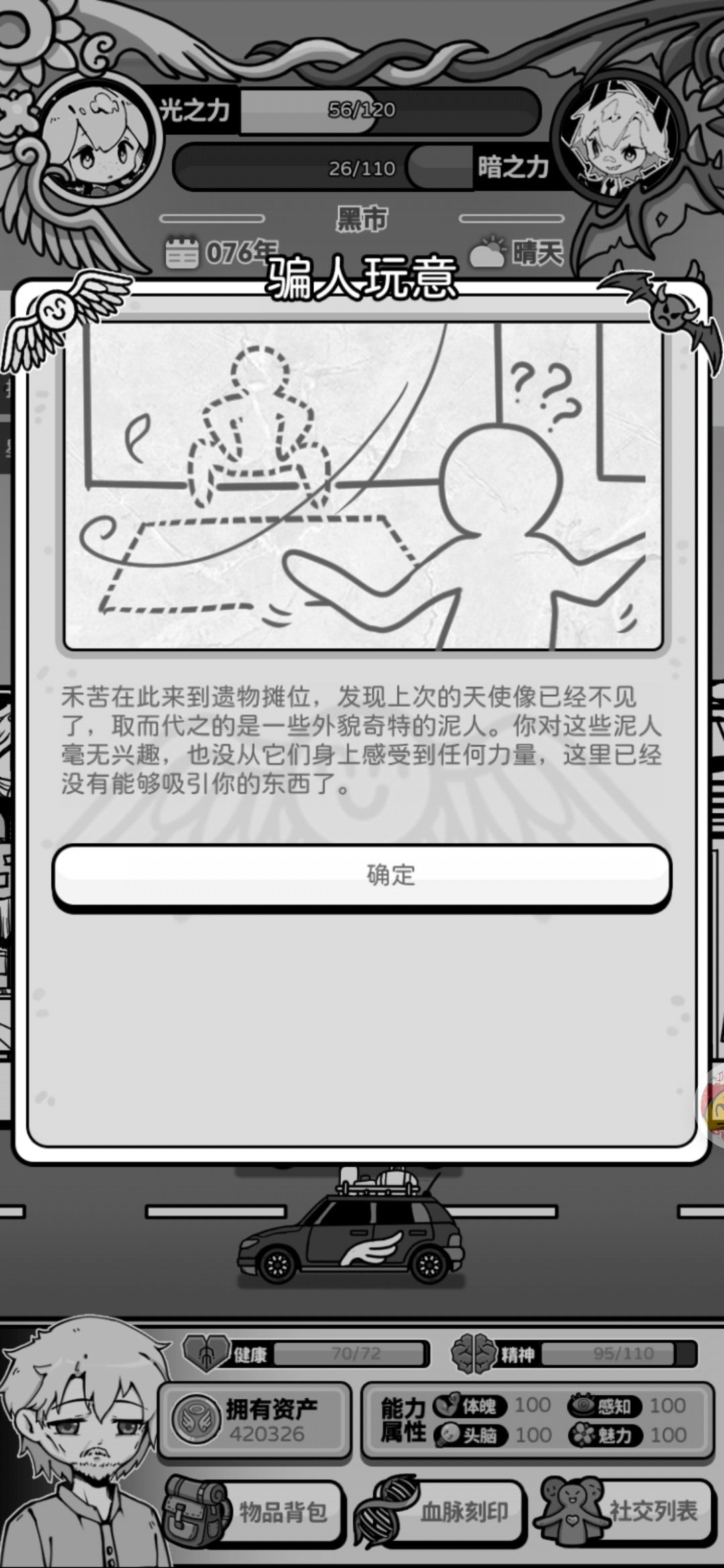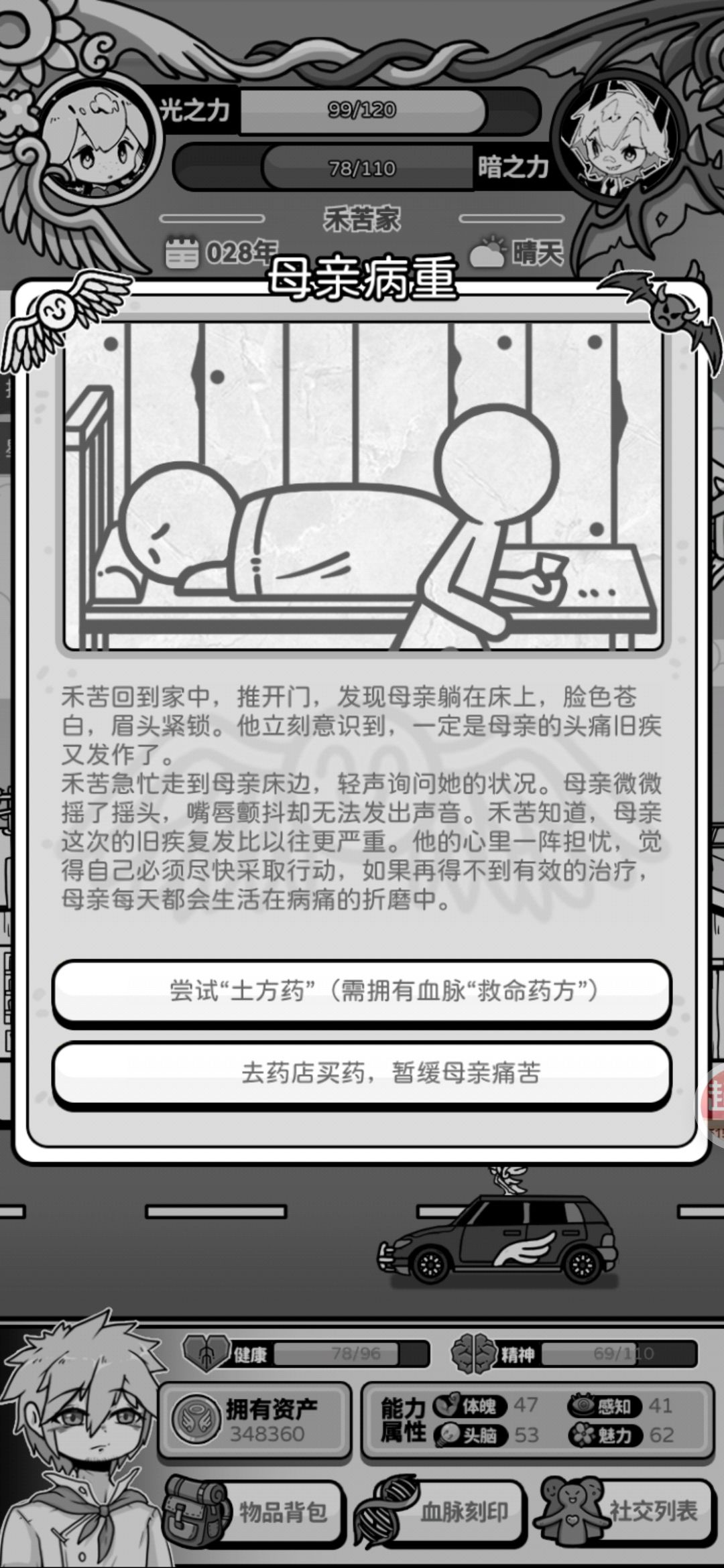 其次是这次更新的黑市,受这次影响黑市多了个救命药方,唯一问题是必须是28岁之前去才有用,而且买了之后也没多大影响。做这个事件必须买车且必须耗费一次出行次数去黑市,做了之后等到28岁跳出事件,会回十点健康与十点精神,买药血脉会消失。