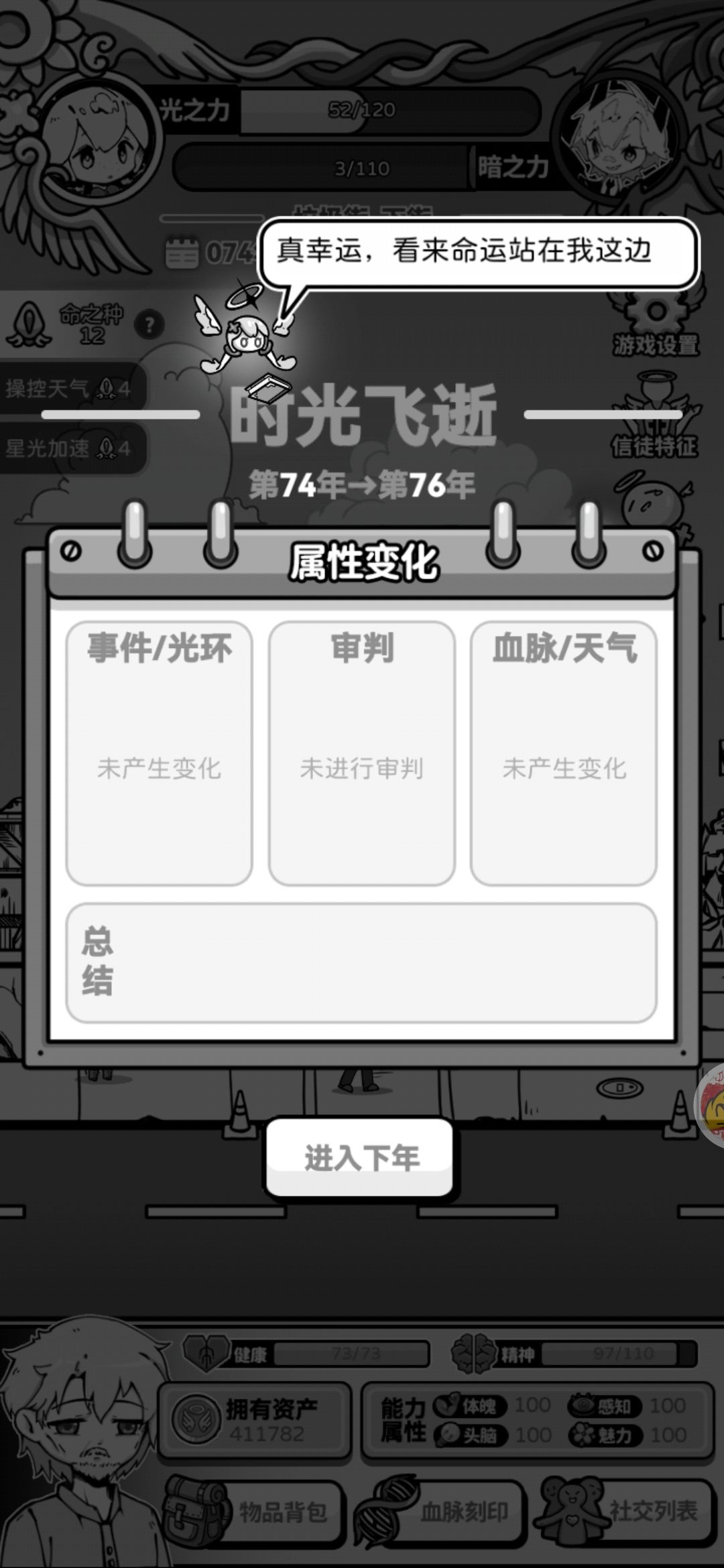关于天使宅,数值是改回去了,可惜还是死在血脉下而不是留下一条命去下次审判。而且退休后每年总结变成空白。