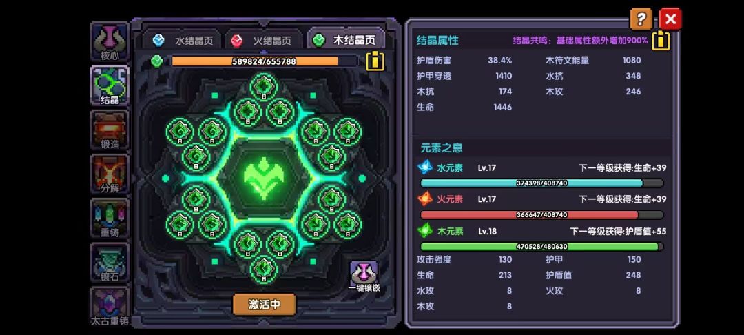 宝石聚合:宝石聚合里面放魔神石升星升级,不要升级除聚合区以外的宝石!聚合区可以把聚合区里面的平均最低等级和星数共享给共鸣区的宝石,当然前期我们魔神石拉不了多少星,所以共鸣区就放置紫色、橙色宝石并且升星。
