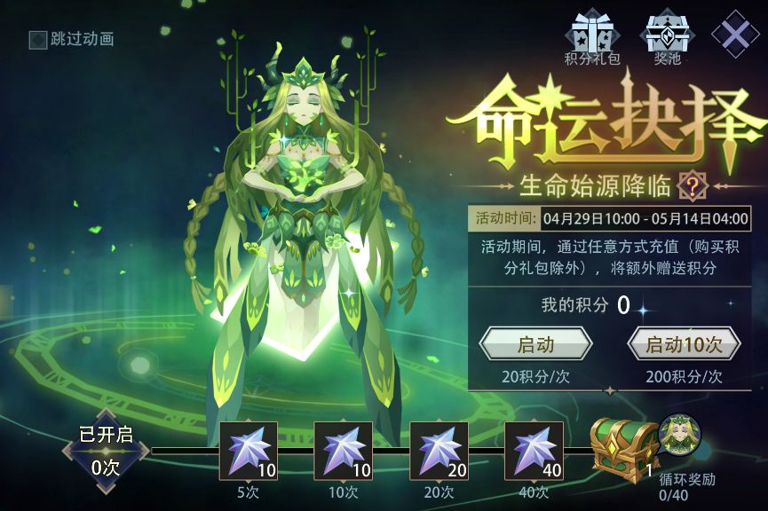 活动内容:活动期间,通过任意方式充值(购买积分礼包除外)额外赠送“积分”,1元等于1“积分”。需要消耗“积分”来启动游戏,可获得神系英雄[生命之源]、全新皮肤[心灵共鸣者]、卡背[永恒之树]、4款“动态头像”等。