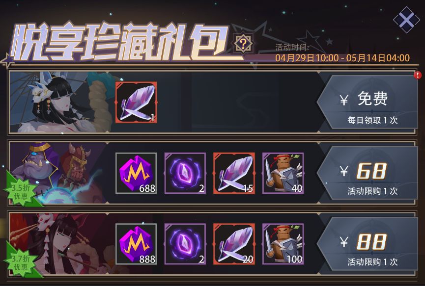 活动内容:活动期间,免费礼包每日可领取一次,可获得[次元碎片]×1;次日04:00刷新。活动期间,其他礼包限购一次,可获得“英魂”、“次元碎片”、“训练假人”等等礼。