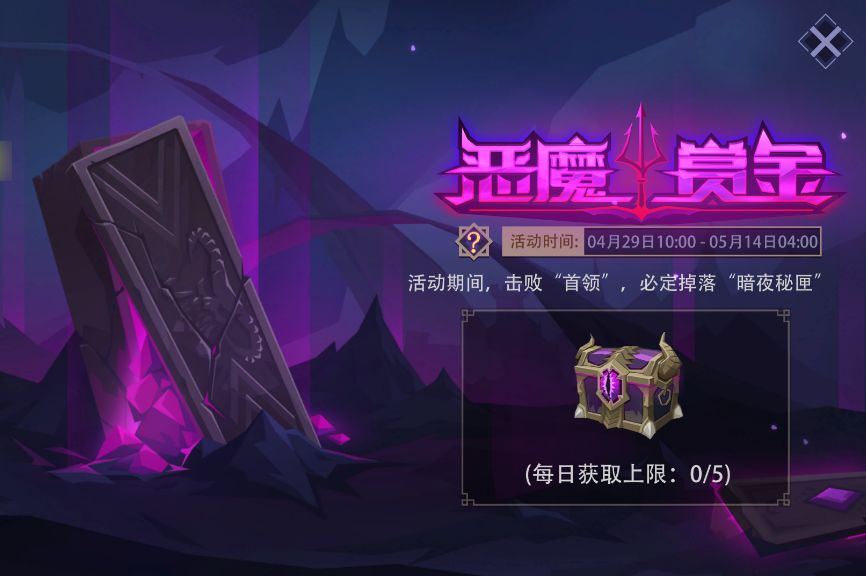 活动内容:活动期间,在[冒险模式]/[冒险试炼场]/[梦魇模式]下击败每一层的“首领”,均可掉落“暗夜秘匣”;每日上限为5个。“暗夜秘匣”打开后能获得随机数量的魔晶,还有30%几率获得“勇士英魂”。