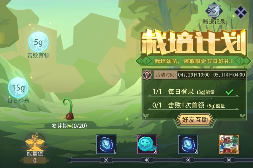 活动内容:通过每日登录、每日击败1次首领、每日好友互助等方式可获得能量。点击“能量图标”可进行收获。植物会根据获取的能量自动进行成长;达到对应能量值可获得“英魂”、“英魂碎片”、“限定头像”等阶段性奖励。植物首次“成熟”后,会进行二次生长;你还可额外获得后续的阶段性成长奖励。