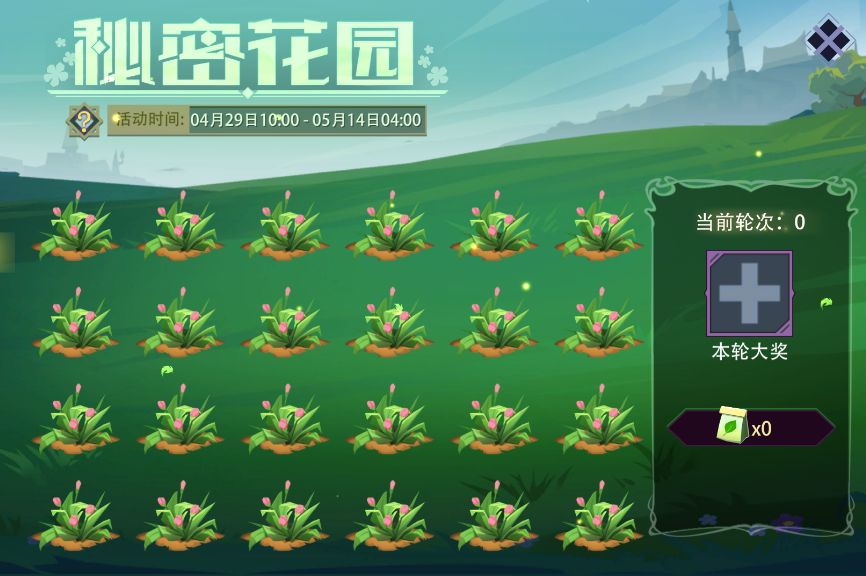 活动内容:活动期间,消耗“有机花肥”来为花园施肥,每次能获得随机奖励,并有概率获得所选大奖。每一轮开始时可自选一项大奖,每10轮游戏还可以自选更丰厚的终极大奖。
