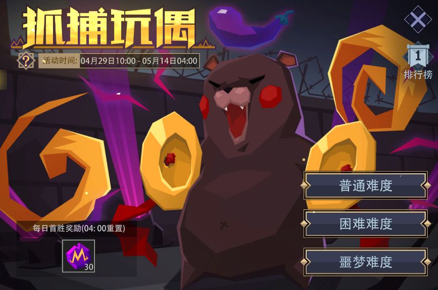 活动内容:玩偶失去控制,四处乱窜,需要您合理放置陷阱将其捕获。游戏分为普通、困难、噩梦三种难度,无论哪种难度下进行游戏,只要每日首次胜利即可获得奖励;次日凌晨04:00刷新。“抓捕成功”才有机会进入排行榜,按照难度和步数进行排名。