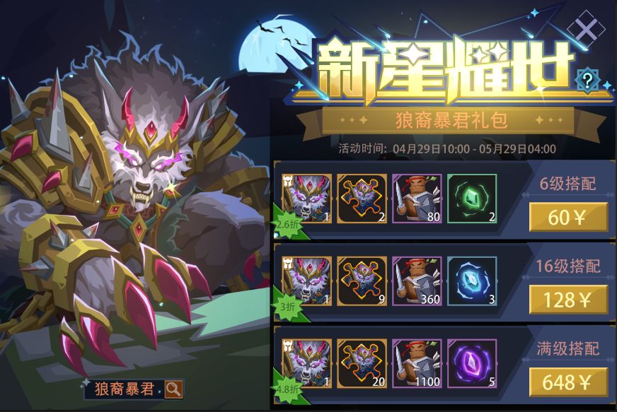 活动内容:活动期间,新英雄[狼裔暴君]相关礼包推出,每种礼包限购一次。购买即可获得“[狼裔暴君]英雄本体”、“[狼裔暴君]英雄碎片”、“英魂”、“训练假人”等豪礼。