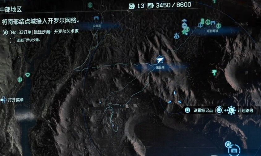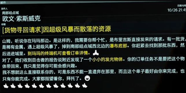在前往山区结点城之前,看看邮件,有人要山姆去南部结点城西北的瀑布底部收集稀有矿物。另外,邮件中的发光物体指的当然就是存储芯片,可以留意一下。