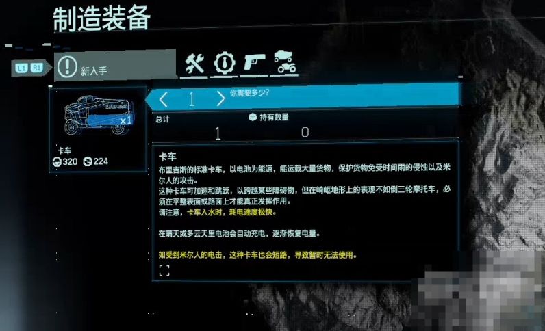 另外,现在可以制造和使用卡车了。卡车能装载大量货物,而且装在里面的货物可以避免被时间雨腐蚀。虽然卡车也能跳跃,但面对崎岖的地形还是不如摩托车好用。