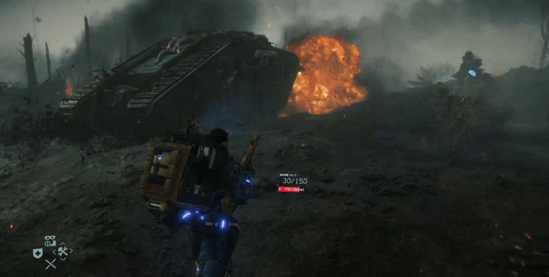 沿着路往前穿过战场,遇到坦克,在坦克的掩护下缓缓行进。全程最好蹲下走,如果受伤了,就捡附近的血袋或隐生虫回血。