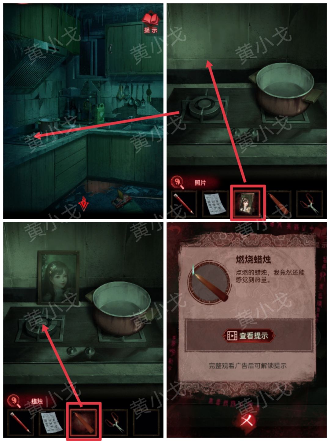22.点击灶台,摆上【照片】,用【蜡烛】点火,获得【燃烧蜡烛】