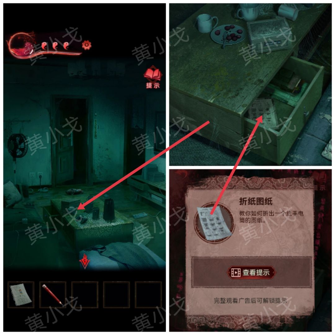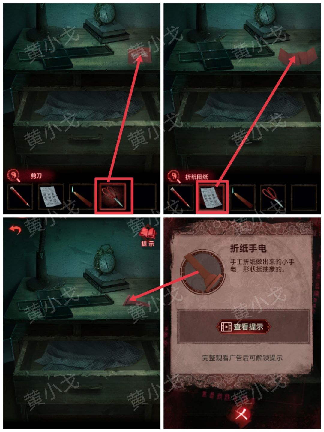 24.点击桌子,用【剪刀】剪开红包;使用【折纸图纸】,获得【折纸手电】