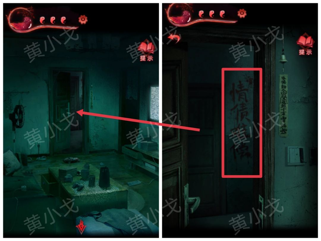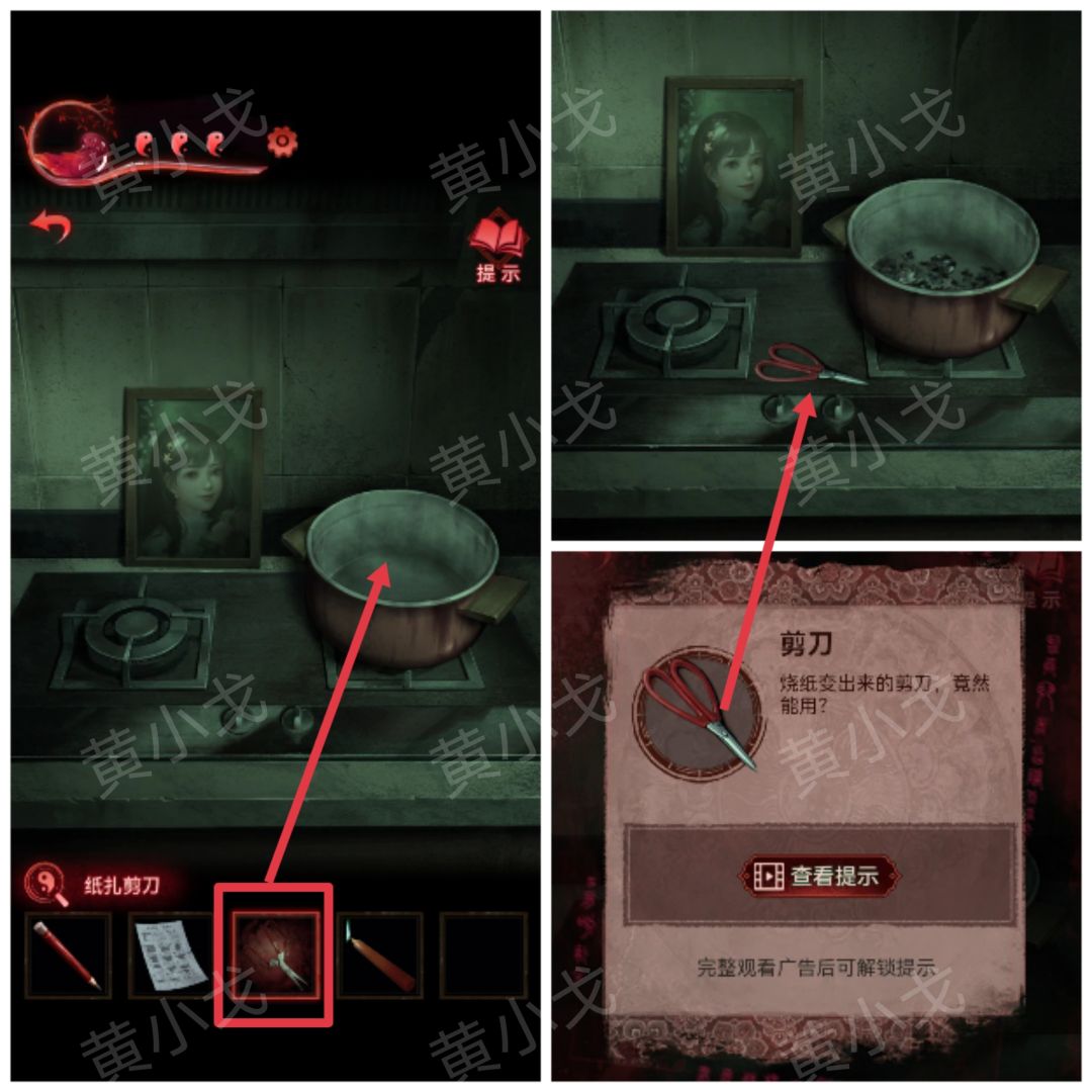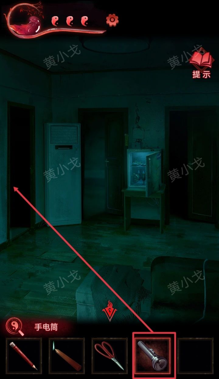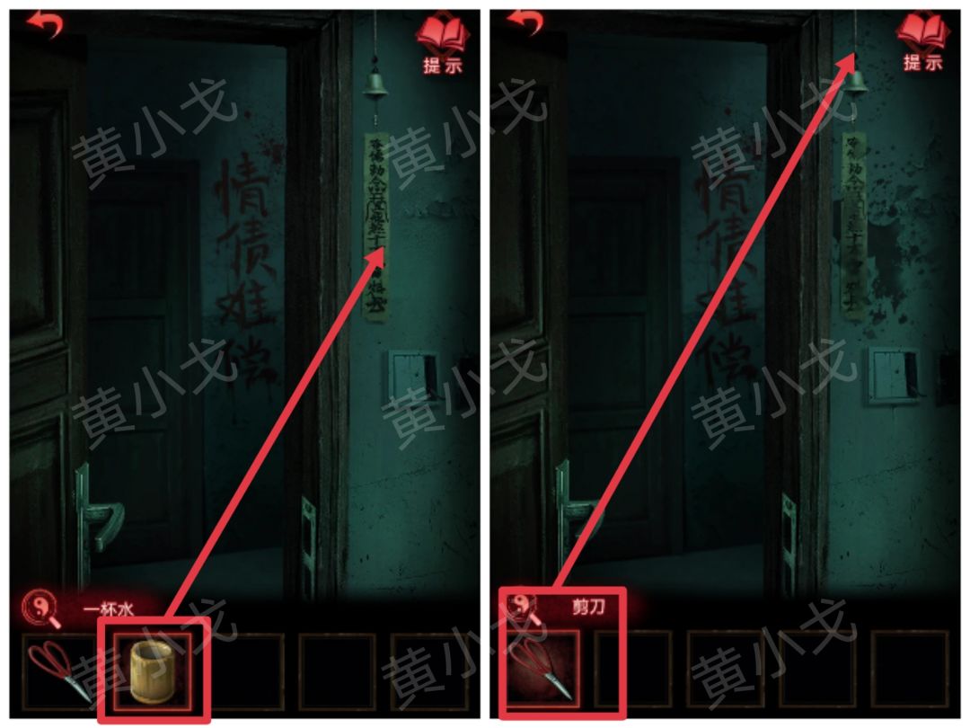 35.用【一杯水】泼门旁边的咒符,用【剪刀】剪掉铃铛,出门,触发剧情