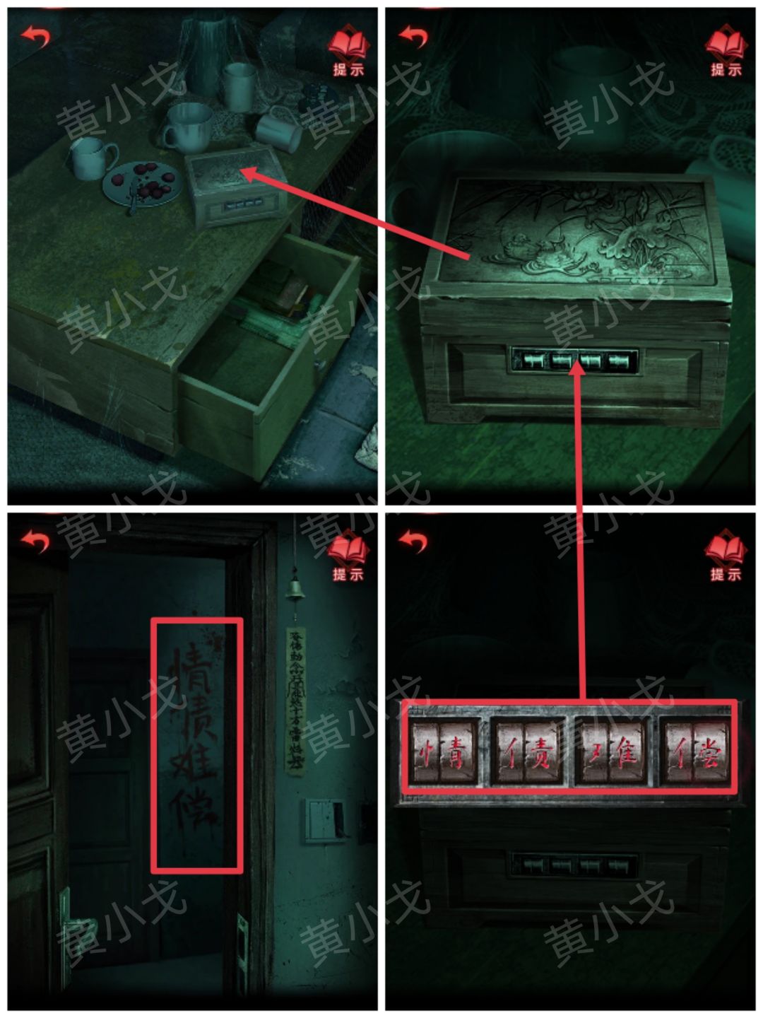 19.点击茶几上的盒子,根据走廊墙上的字,调整密码锁