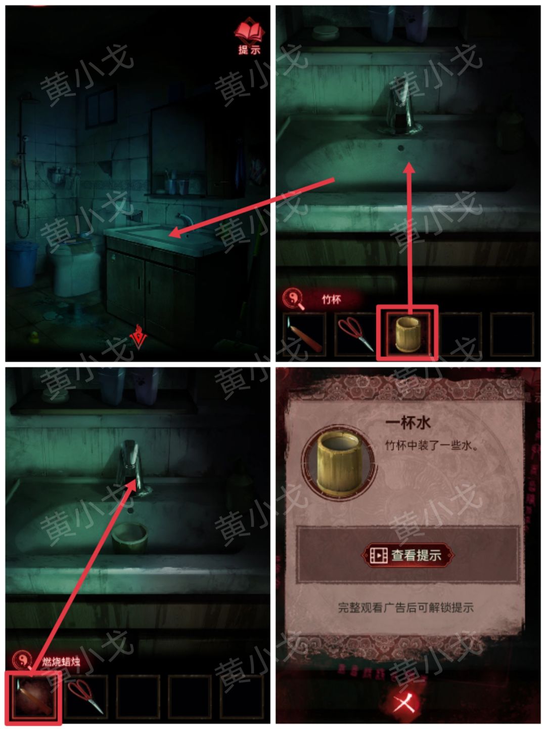 34.点击洗手池,把【竹杯】放入水槽,用【燃烧蜡烛】感应水龙头出水,获得【一杯水】